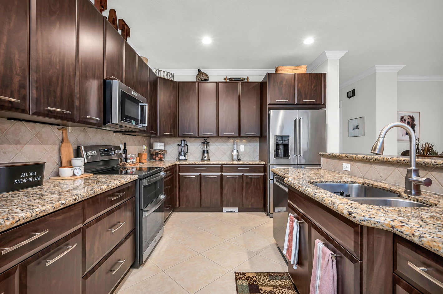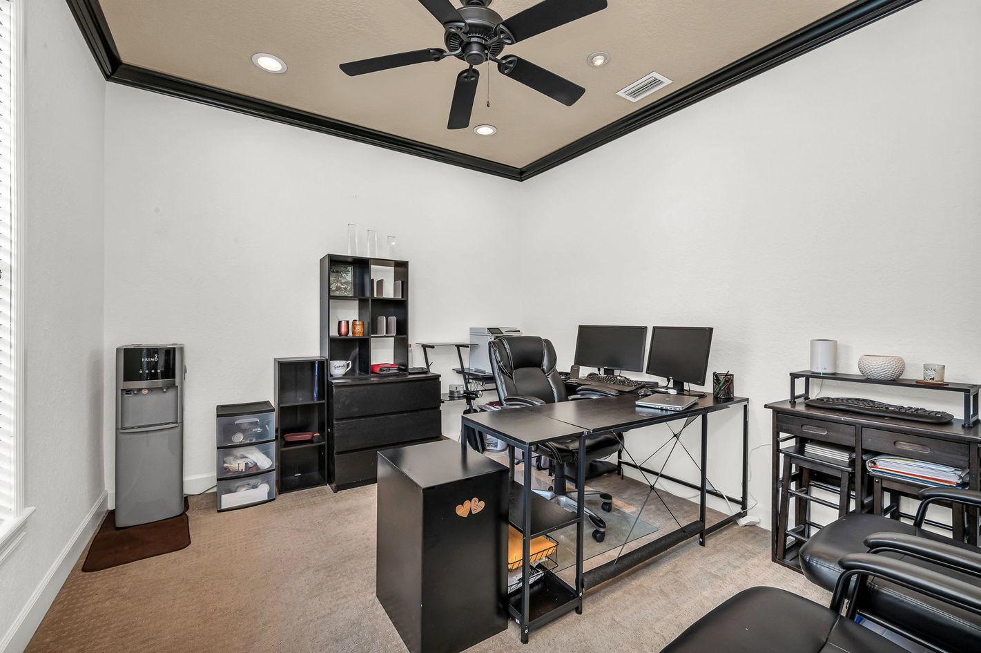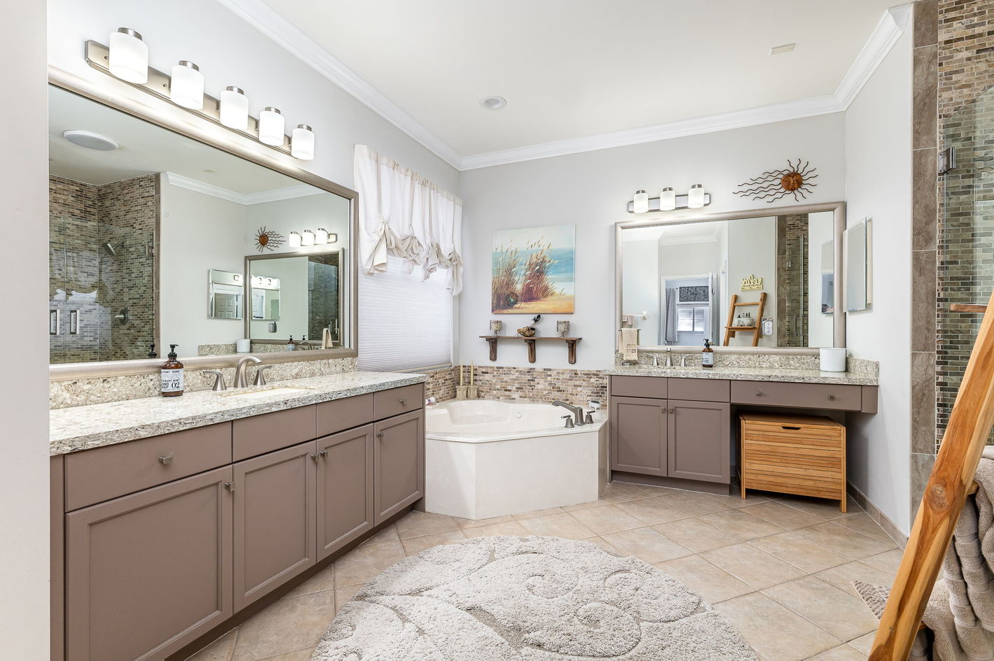 Welcome to luxury living in the gated community of Savanah Estates. Enter through the new designer double doors into a spacious foyer with a 20-ft ceiling and crown molding throughout. The formal living room is bright and sunny with great wall space for furniture placement. Formal dining room just off the kitchen with space for china cabinet. Beautiful floors throughout the first floor. The gourmet kitchen has newer stainless steel appliances and granite countertops. There is ample counterspace for meal preparation and an abundant amount of cabinets for storage. The kitchen opens to the large family room ideal for entertaining. Behind the kitchen is flex space. This works well for a home office, workout room or bedroom number five. A first floor guest room adjacent to an updated full bath can be an in-law suite with one level living. Enjoy your morning beverage on the balcony just off the primary bedroom which overlooks the large backyard into green space. French doors lead off the Primary Bedroom into a large private sitting room (which can be converted into a 6th bedroom). The primary bath is elegant and large with double sink vanity and a tremendous shower with glass doors. There is no shortage of storage in the large closets. There are two additional bedrooms on the second floor and another full bath with tile flooring and shower. A large loft area can be a home theater, game room or music area. There is plenty of space for everyone. You will love outdoor entertaining on the large paver patio with built in grill, casual sitting area and lighted eating space. Other endearing features include: 2-zone air conditioners that were replaced in 2018 and 2020. New roof and gutters installed in 2020. 2 car garage features overhead storage, refrigerator and new epoxy floor. This home has a full-house security system, hurricane shutters, central vac and is wired for speakers throughout, all offered in this move-in ready home. Savannah Estates features sidewalks and streetlights and has a community pool and playground. Lawn maintenance is included in your association fees. In an A+ rated school district.