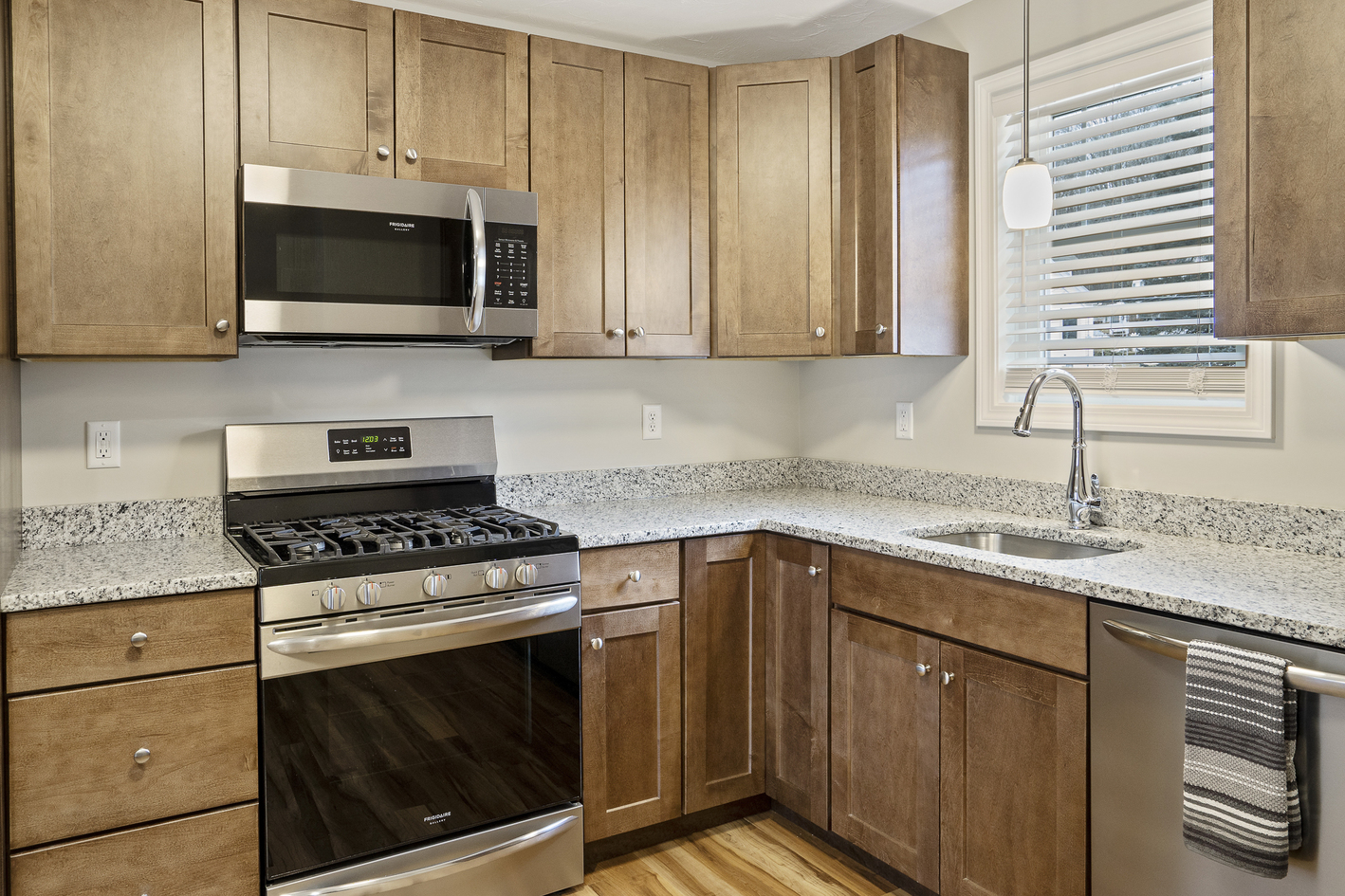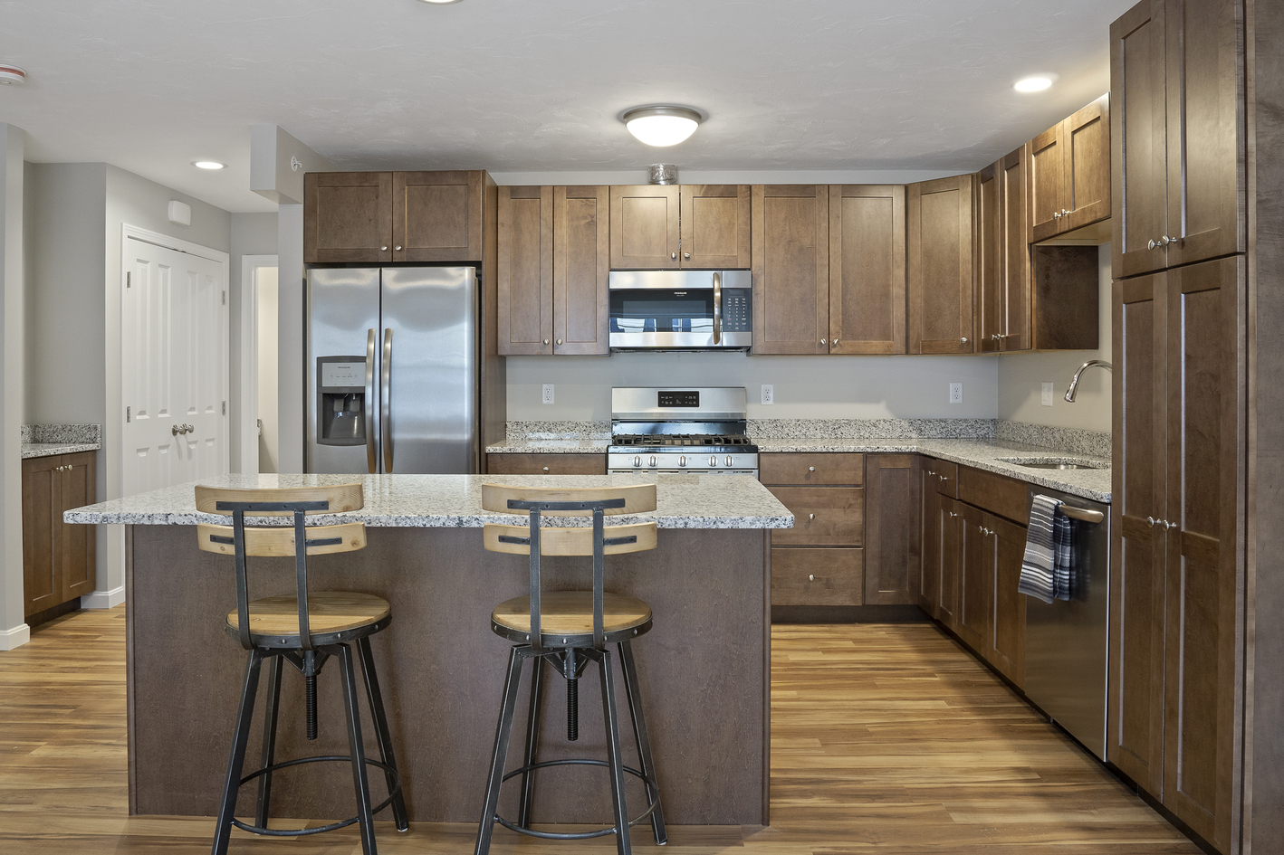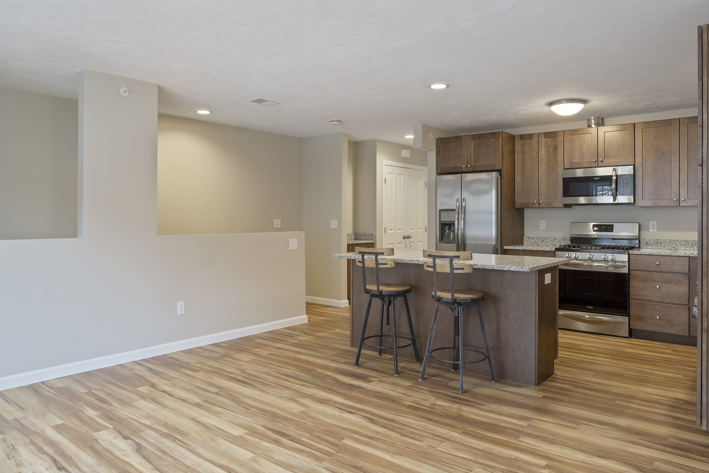 Sparkling new kitchens with SS appliances, granite counter tops and island, plus open space living area, high quality vinyl plank floors throughout, baths have showers stalls, tiled floors, and granite.