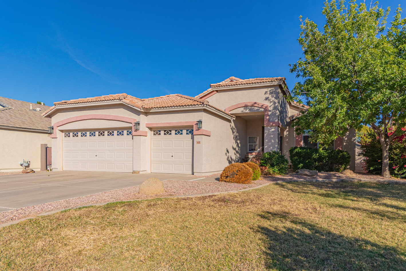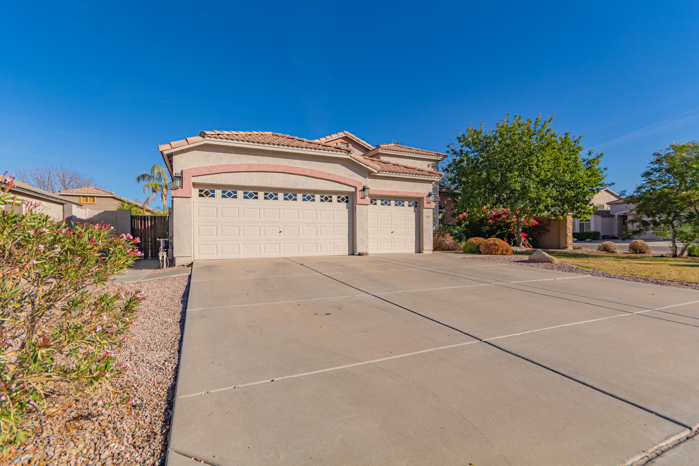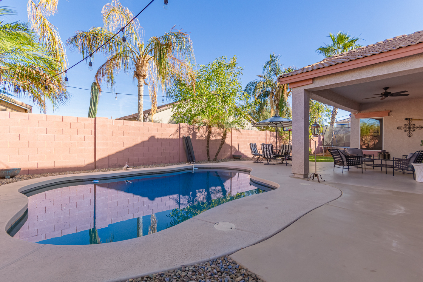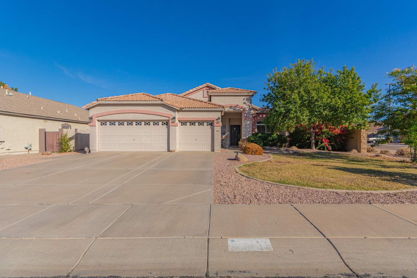 Welcome to this amazing home in the heart of Gilbert, AZ where modern living meets suburban charm! Step into this spacious home with over 1900 sq ft of stunning living space including 4 bedrooms, 2 bathrooms and an oversized, 3-car garage. The beautiful kitchen is ready to host your friends and family, with quartz counters, tile backsplash, a center island, and large walk-in pantry. The great room has tile throughout and a built in office nook, perfect for work from home or that after school home work. Separate formal dining/seating area. Primary bedroom has a separate tub and shower, dual sinks and walk-in closet with built in organizers. 2 of the 3 secondary bedrooms have walk-in closets. Step into the backyard oasis with a refreshing private pool, perfect for Arizona's sunny days.