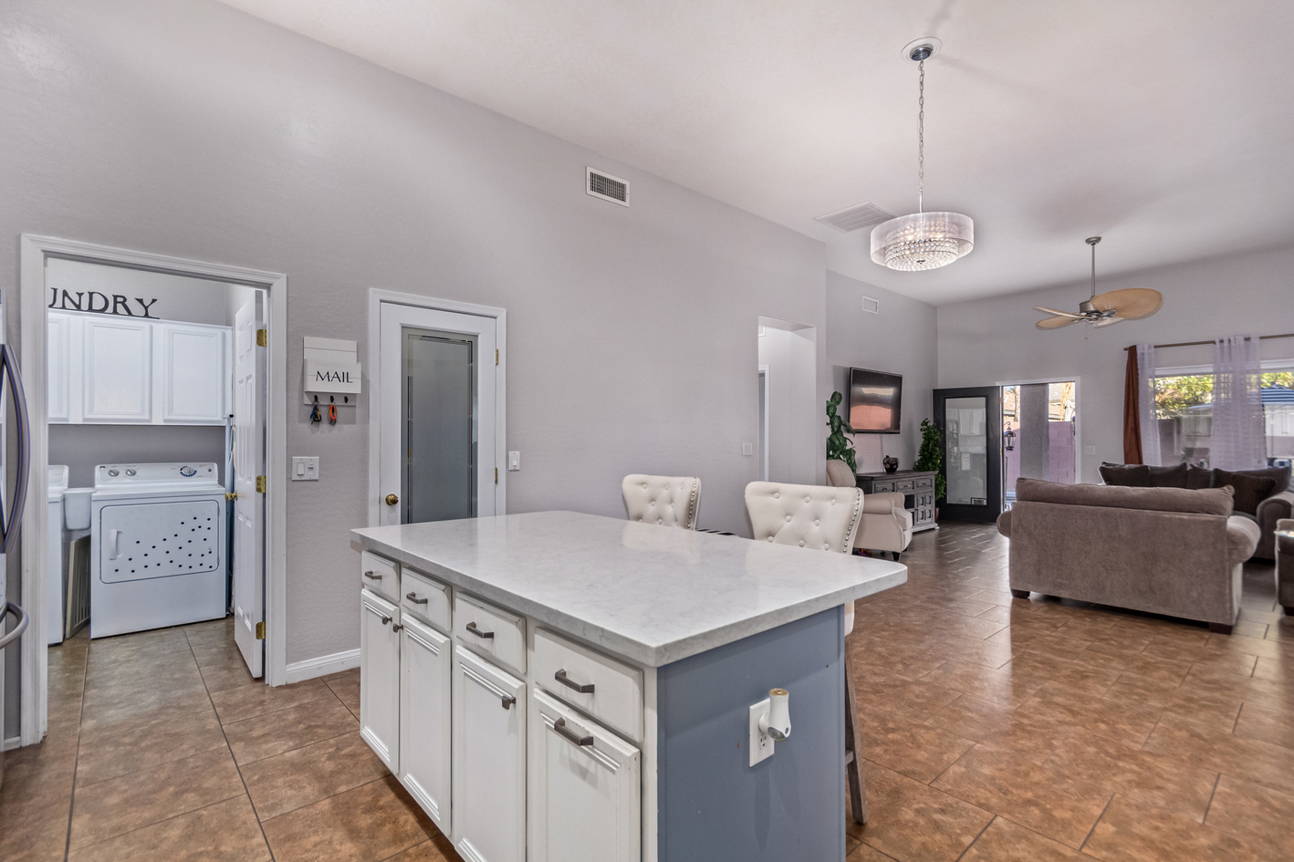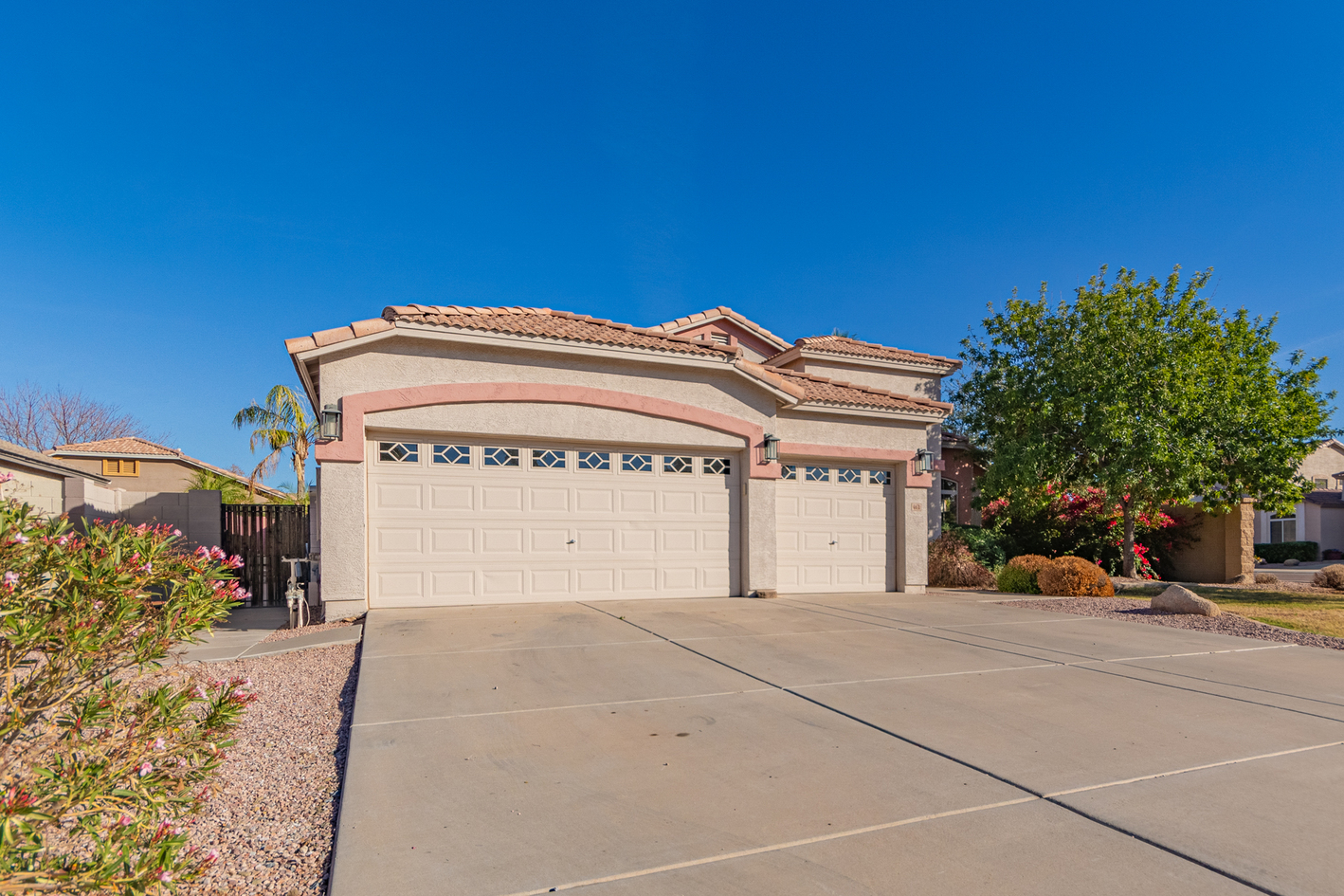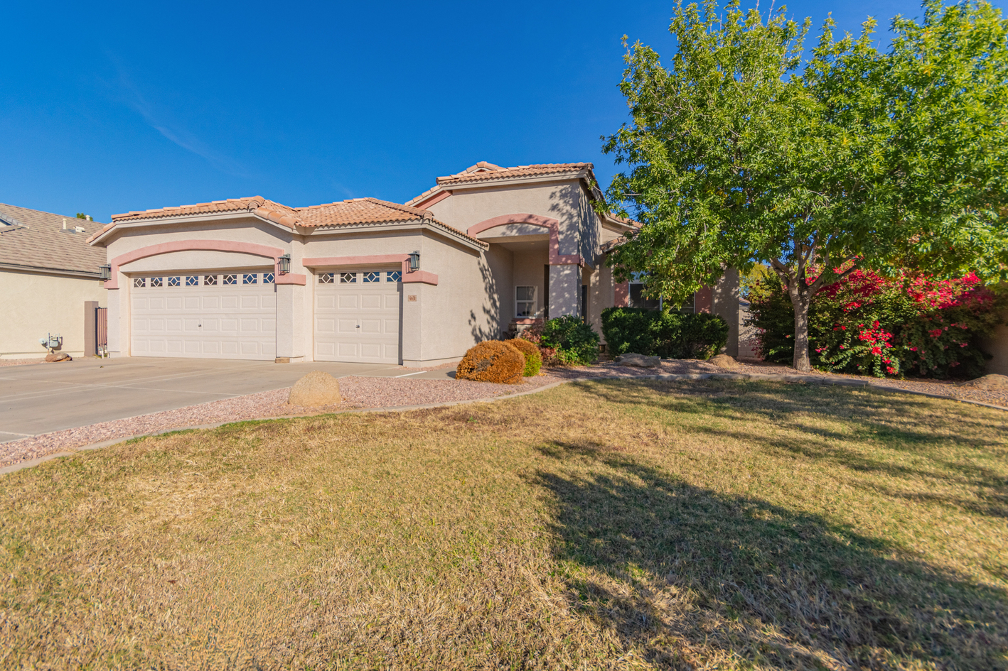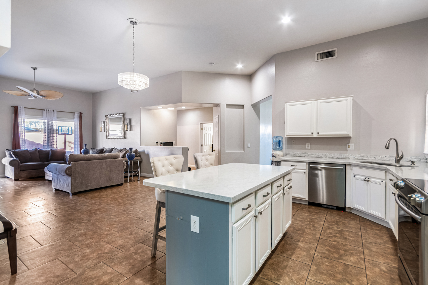Welcome to this amazing home in the heart of Gilbert, AZ where modern living meets suburban charm! Step into this spacious home with over 1900 sq ft of stunning living space including 4 bedrooms, 2 bathrooms and an oversized, 3-car garage. The beautiful kitchen is ready to host your friends and family, with quartz counters, tile backsplash, a center island, and large walk-in pantry. The great room has tile throughout and a built in office nook, perfect for work from home or that after school home work. Separate formal dining/seating area. Primary bedroom has a separate tub and shower, dual sinks and walk-in closet with built in organizers. 2 of the 3 secondary bedrooms have walk-in closets. Step into the backyard oasis with a refreshing private pool, perfect for Arizona's sunny days.