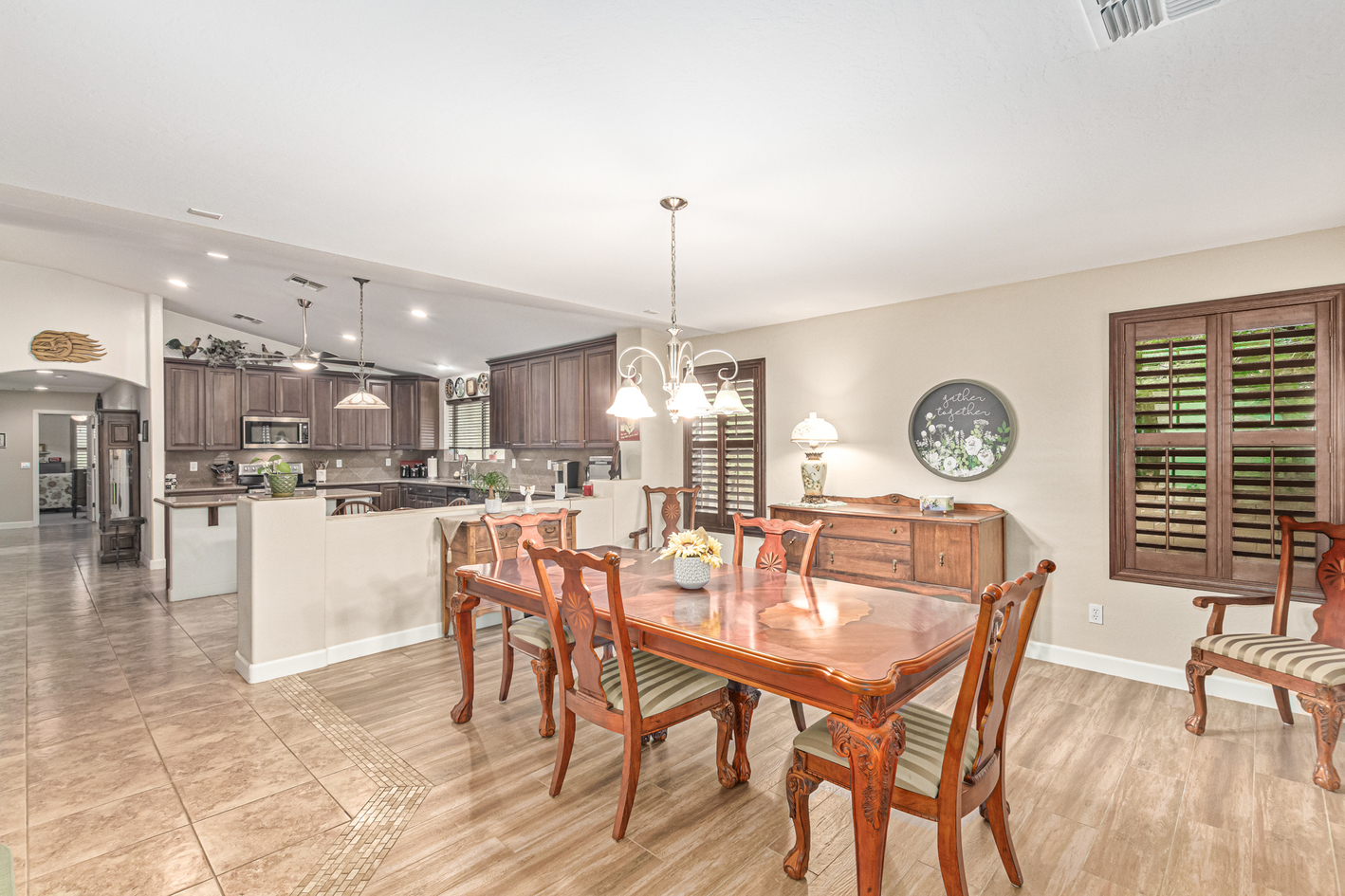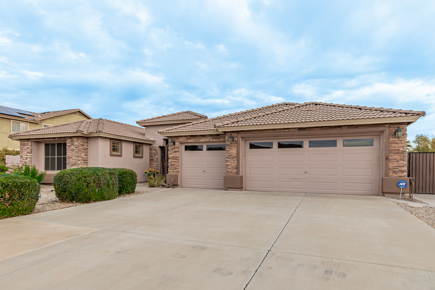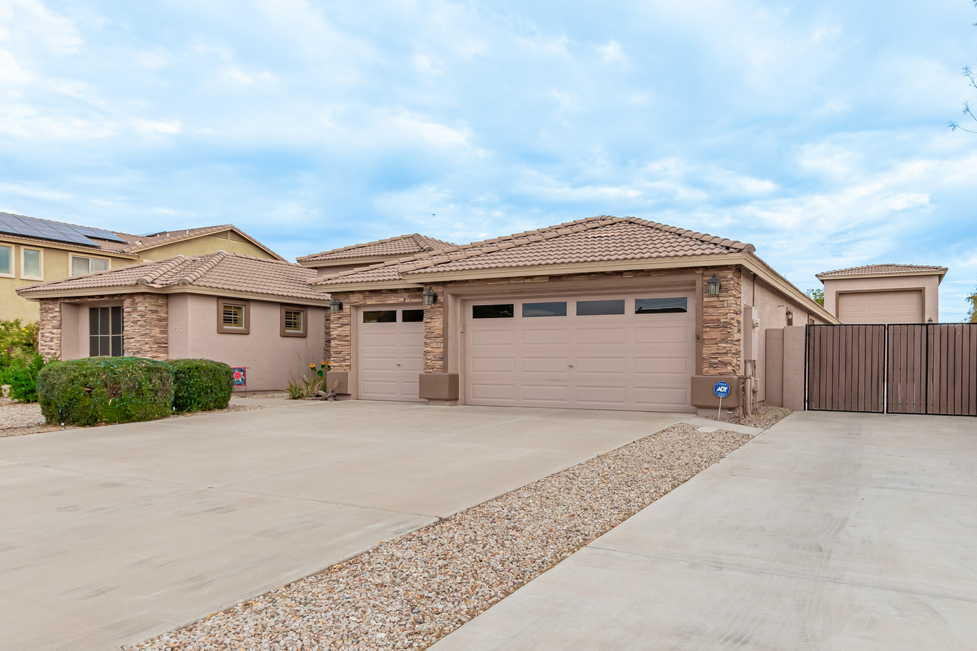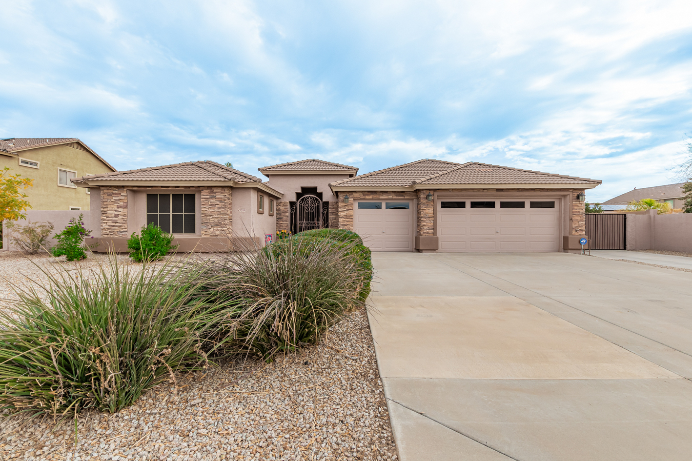 Elevate your single-level living experience in this outstanding property in the esteemed Johnson Ranch! This beauty flaunts striking stone accents, a large front yard, a 3-car garage, an RV gate, & extended driveway. Discover a spacious great room & a separate dining room. The home's elegance is evident w/soaring vaulted ceilings, classic & wood-plank tile flooring, plantation shutters, ceiling fans, & charming light fixtures. The chef's kitchen is fully equipped w/granite counters, a granite tile backsplash, a wine rack, a breakfast nook, & an island w/a breakfast bar. A plethora of wood cabinetry w/crown molding & a walk-in pantry ensures ample storage space. Double doors open to a carpeted den, ideal for a home office.