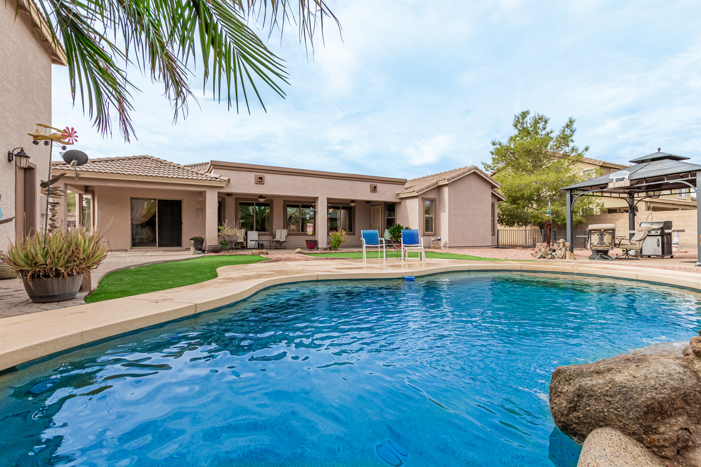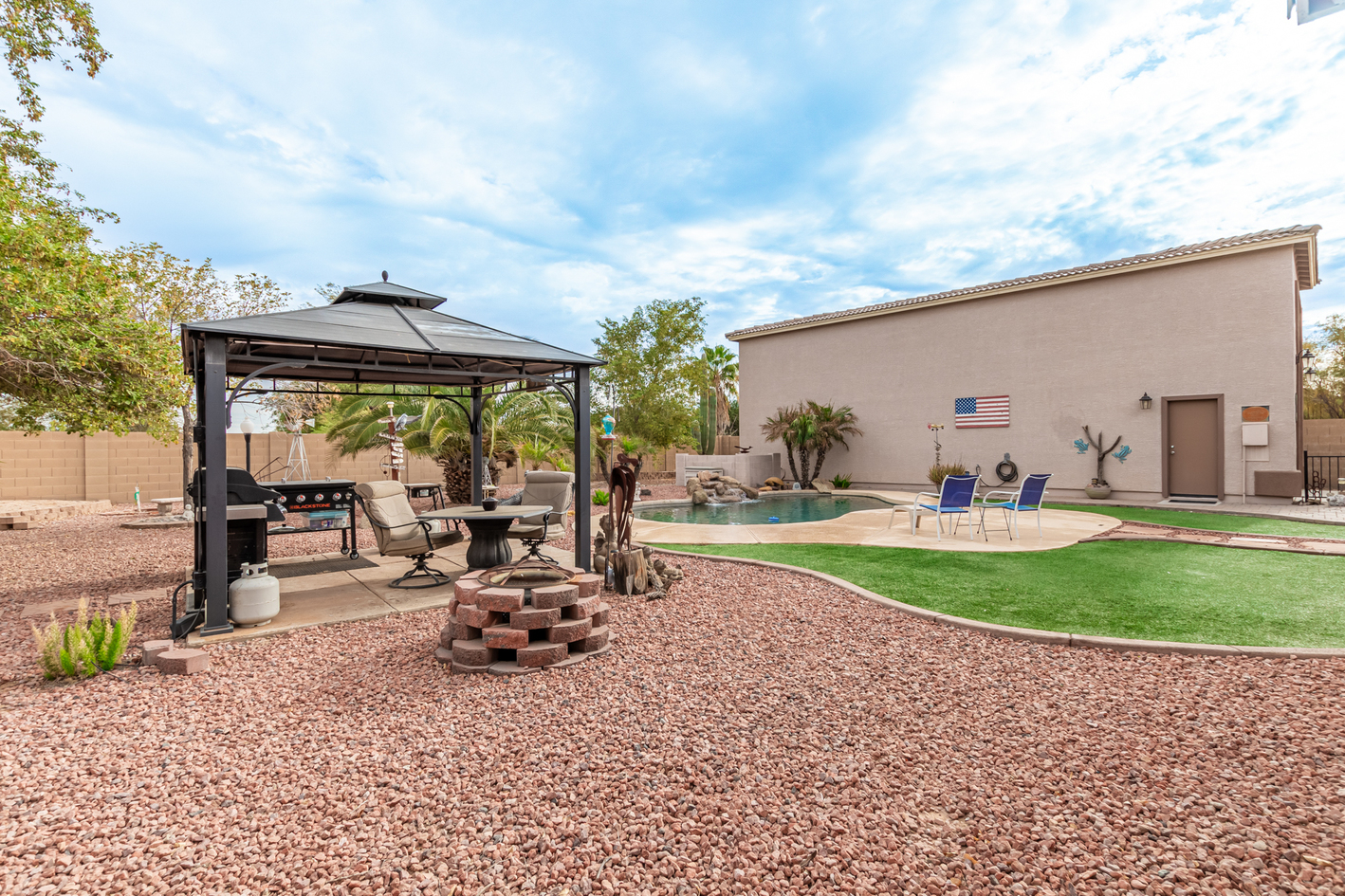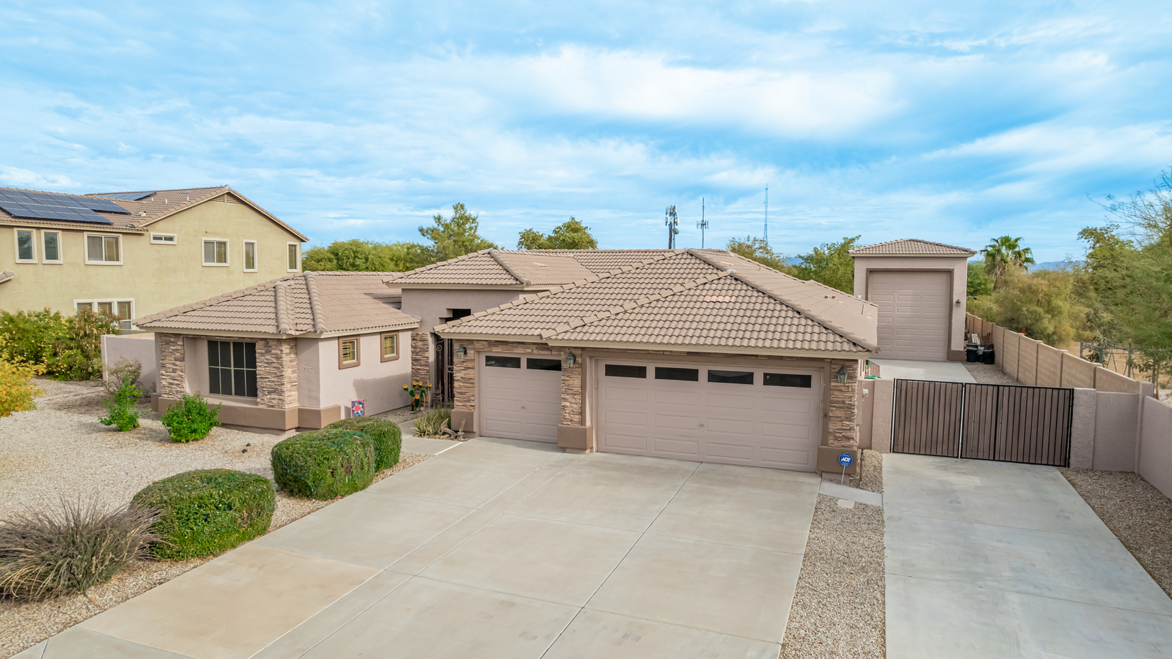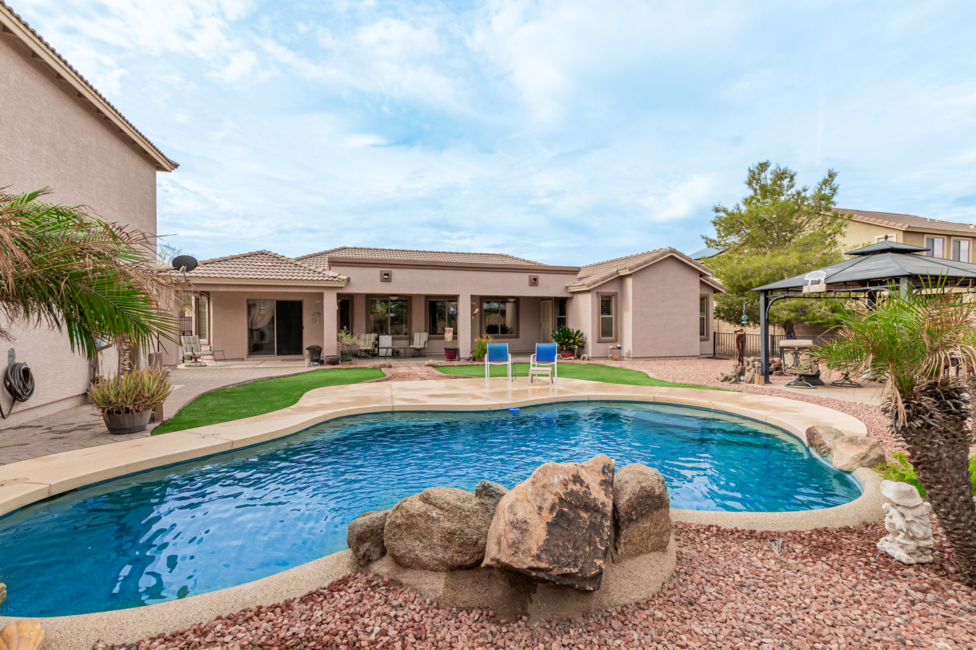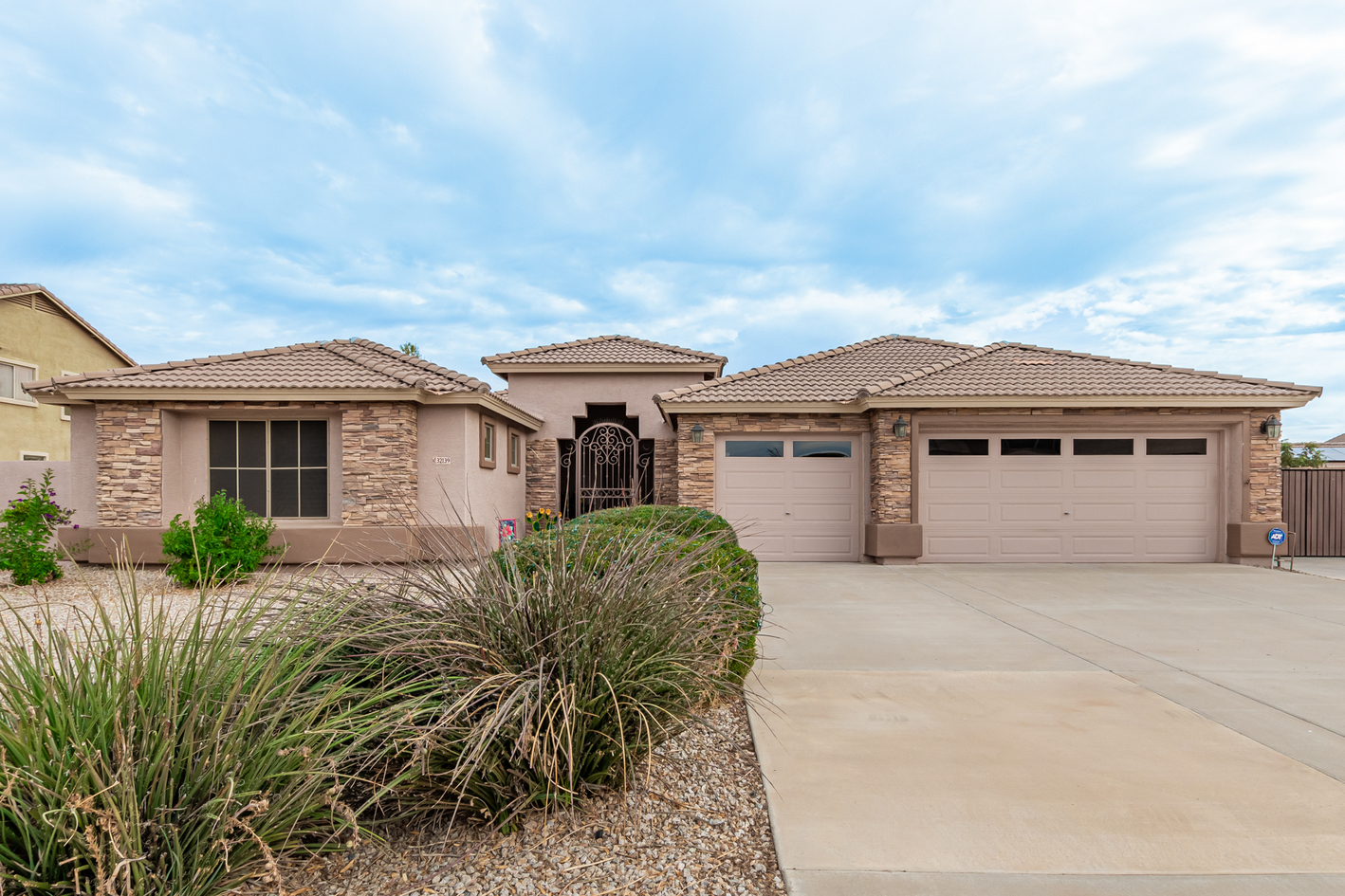 Elevate your single-level living experience in this outstanding property in the esteemed Johnson Ranch! This beauty flaunts striking stone accents, a large front yard, a 3-car garage, an RV gate, & extended driveway. Discover a spacious great room & a separate dining room. The home's elegance is evident w/soaring vaulted ceilings, classic & wood-plank tile flooring, plantation shutters, ceiling fans, & charming light fixtures. The chef's kitchen is fully equipped w/granite counters, a granite tile backsplash, a wine rack, a breakfast nook, & an island w/a breakfast bar. A plethora of wood cabinetry w/crown molding & a walk-in pantry ensures ample storage space. Double doors open to a carpeted den, ideal for a home office.
