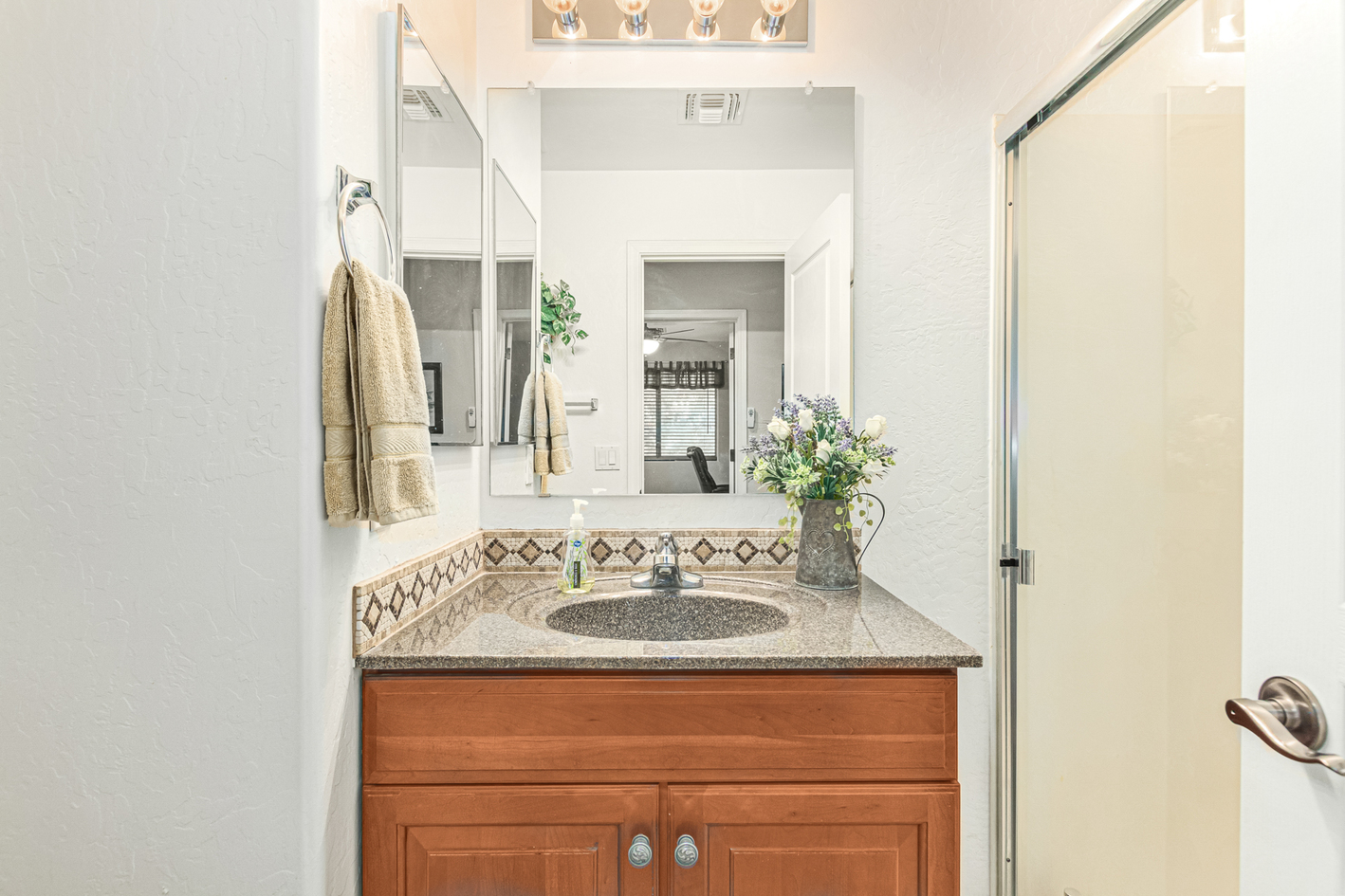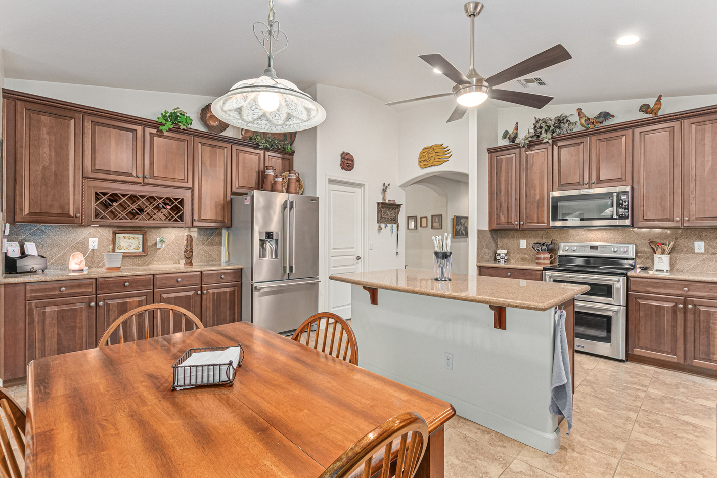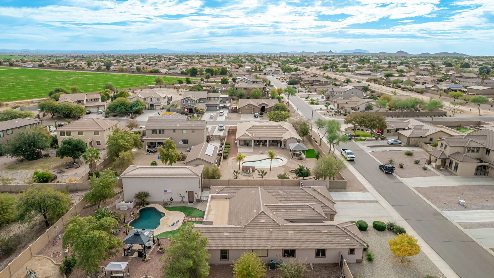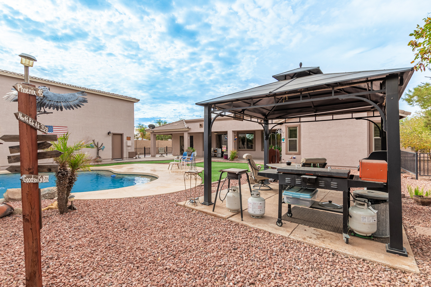 Elevate your single-level living experience in this outstanding property in the esteemed Johnson Ranch! This beauty flaunts striking stone accents, a large front yard, a 3-car garage, an RV gate, & extended driveway. Discover a spacious great room & a separate dining room. The home's elegance is evident w/soaring vaulted ceilings, classic & wood-plank tile flooring, plantation shutters, ceiling fans, & charming light fixtures. The chef's kitchen is fully equipped w/granite counters, a granite tile backsplash, a wine rack, a breakfast nook, & an island w/a breakfast bar. A plethora of wood cabinetry w/crown molding & a walk-in pantry ensures ample storage space. Double doors open to a carpeted den, ideal for a home office.