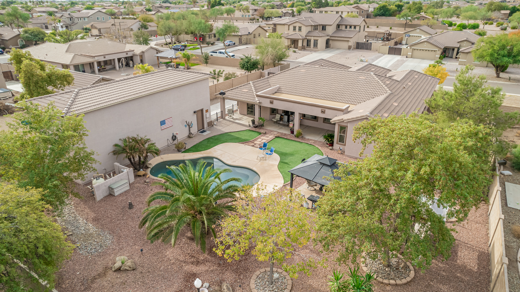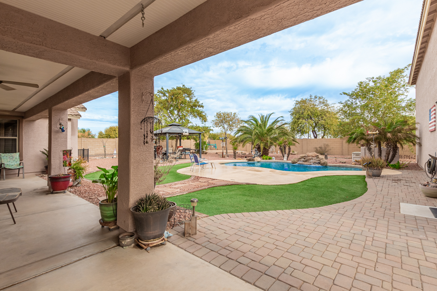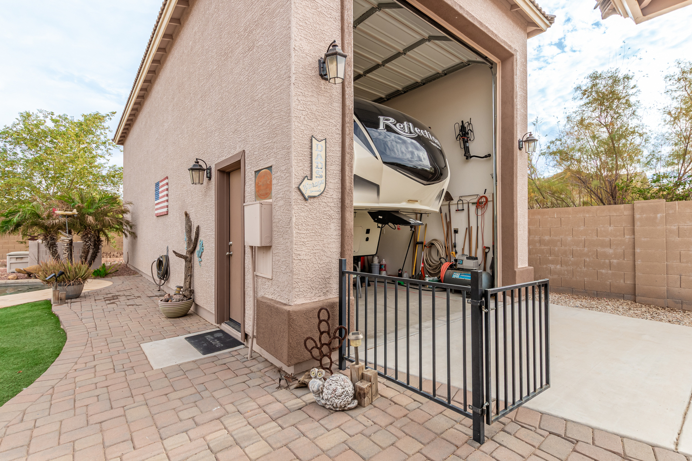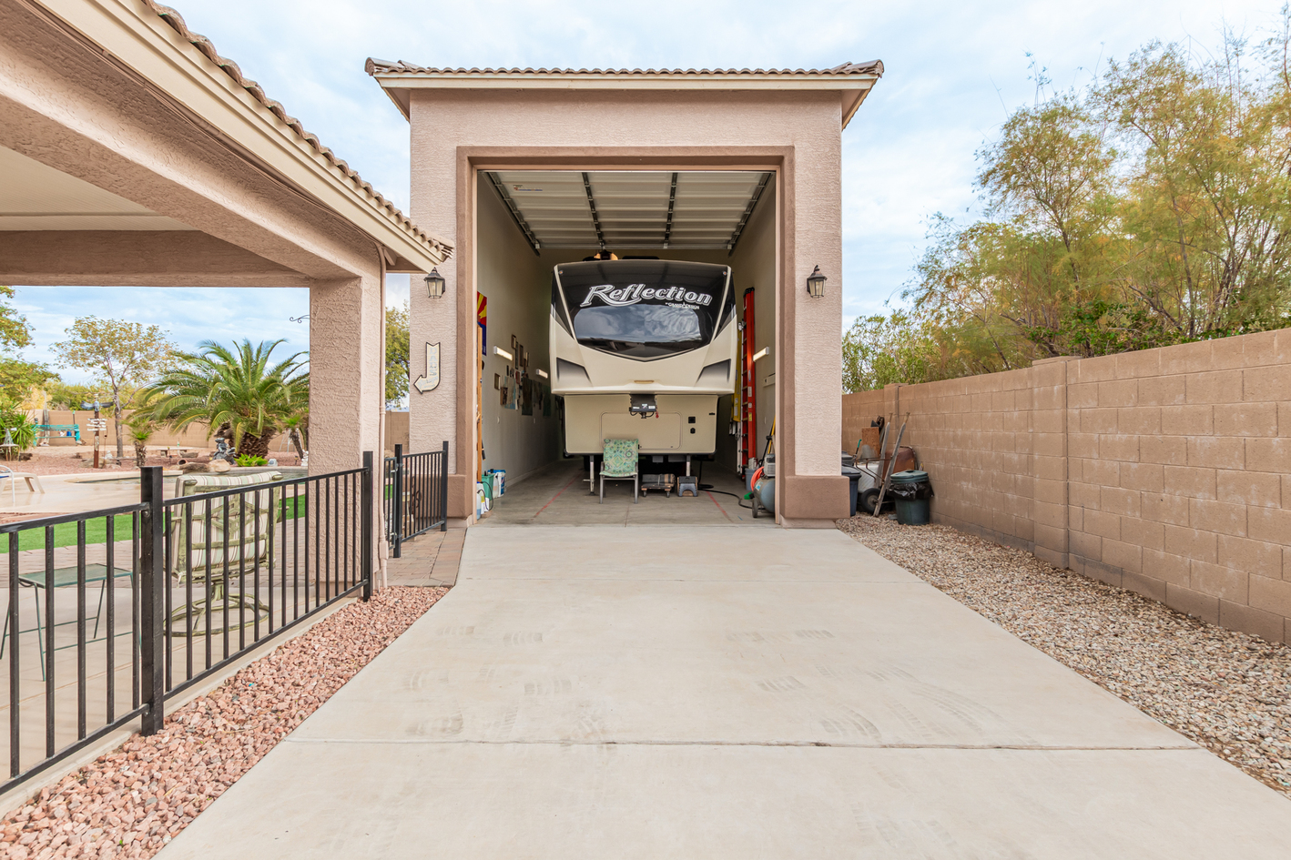 You'll love the main suite that highlights a sitting area with backyard access, a full bathroom & walk-in closet. Secondary bedrooms enjoy a Jack & Jill bathroom! The 3rd bathroom is conveniently located off the hallway. The detached RV garage has a 14' rollup door with opener and is 45' deep, features a workshop area at the rear of the garage. Escape to the backyard paradise that invites you to unwind & have fun! It boasts a full-length covered patio, pavers, artificial turf, a Gazebo, lots of seating areas, & a crystal blue pool. Don't miss the grandeur that awaits in every corner of this remarkable residence!