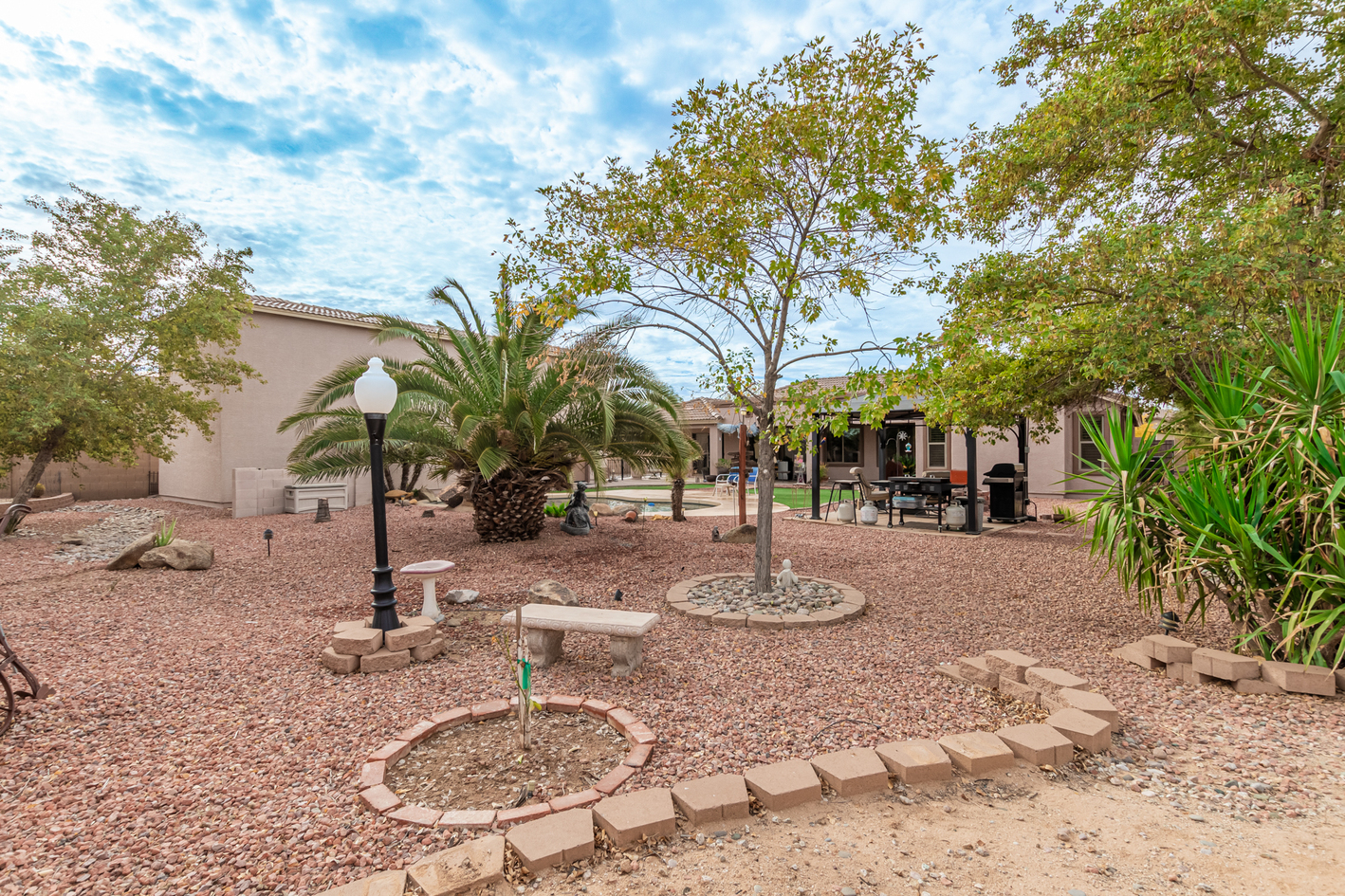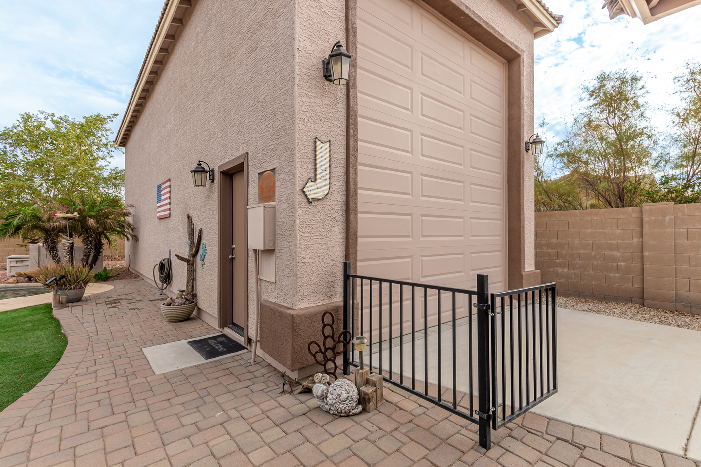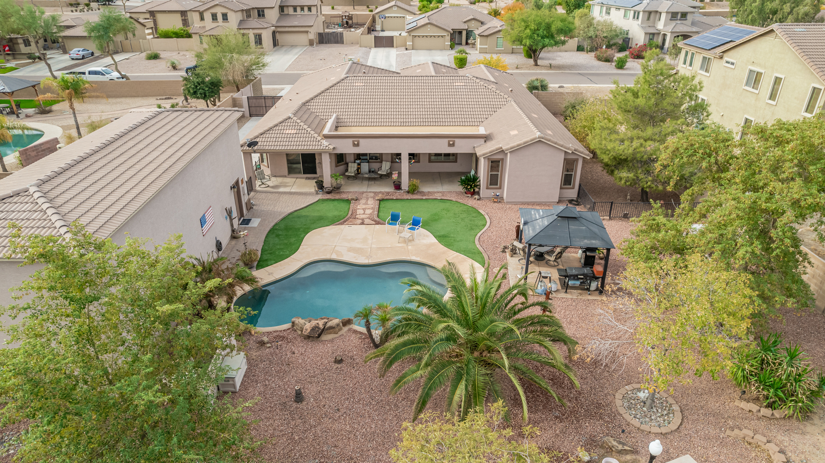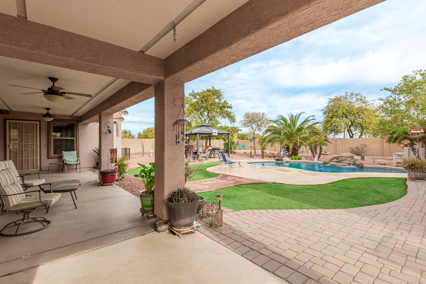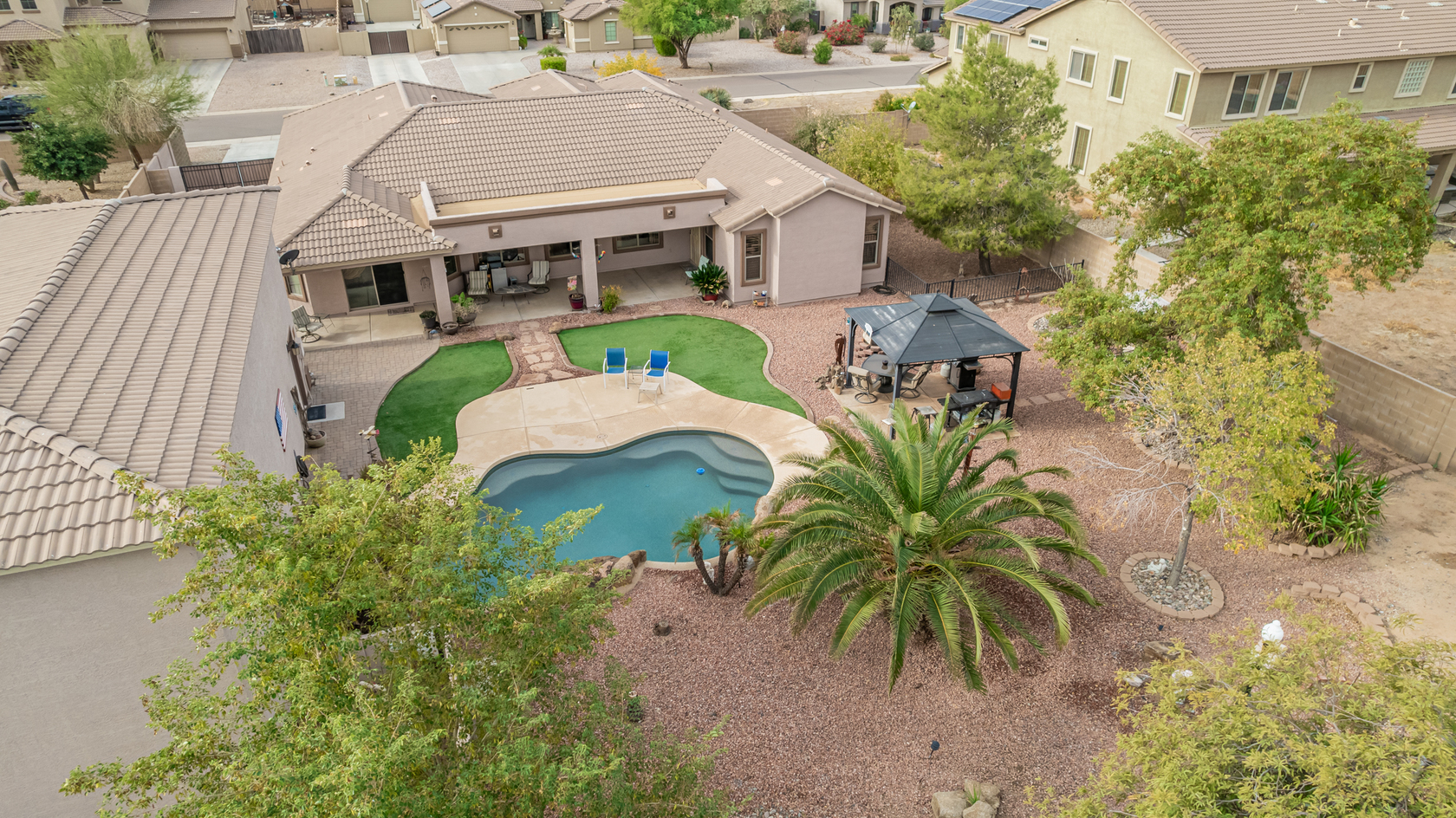 You'll love the main suite that highlights a sitting area with backyard access, a full bathroom & walk-in closet. Secondary bedrooms enjoy a Jack & Jill bathroom! The 3rd bathroom is conveniently located off the hallway. The detached RV garage has a 14' rollup door with opener and is 45' deep, features a workshop area at the rear of the garage. Escape to the backyard paradise that invites you to unwind & have fun! It boasts a full-length covered patio, pavers, artificial turf, a Gazebo, lots of seating areas, & a crystal blue pool. Don't miss the grandeur that awaits in every corner of this remarkable residence!