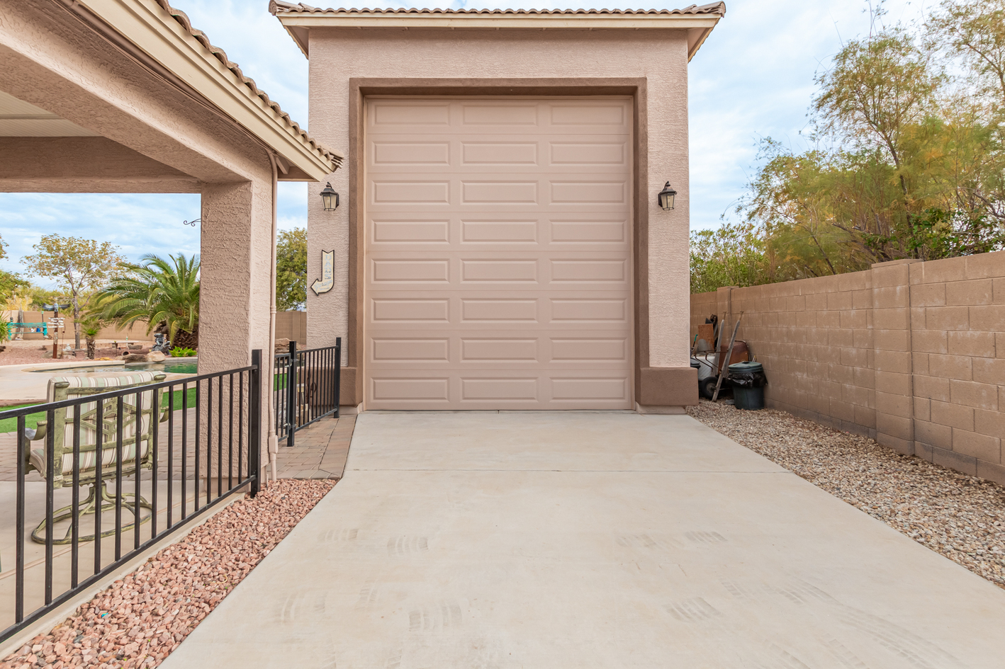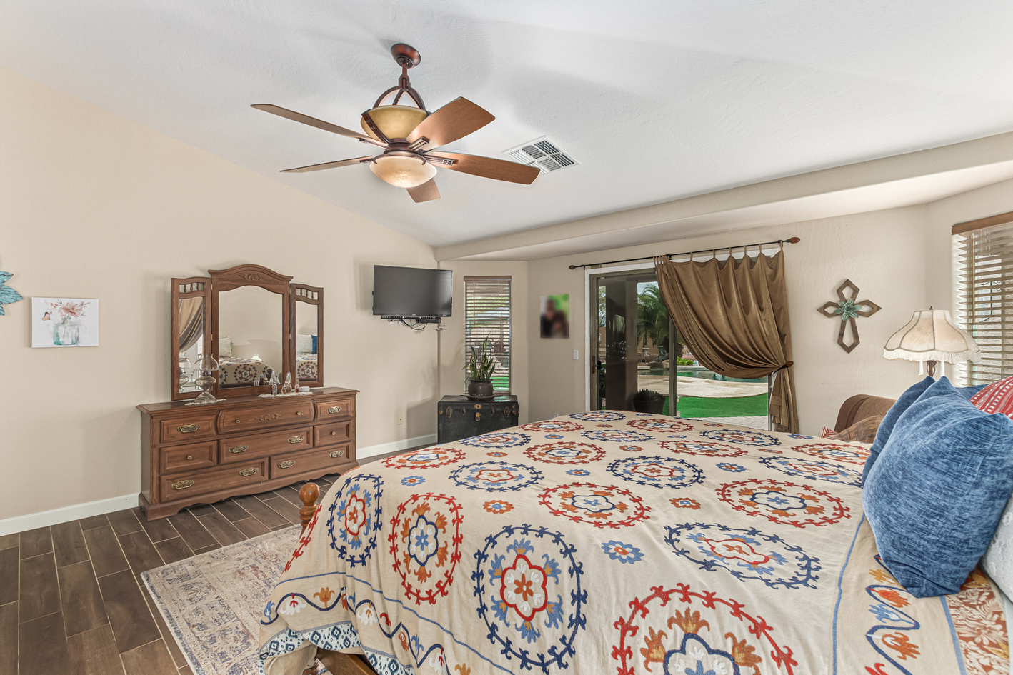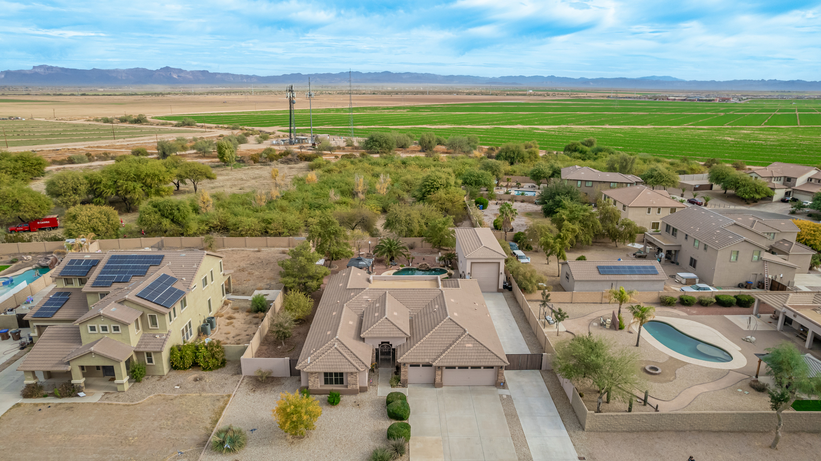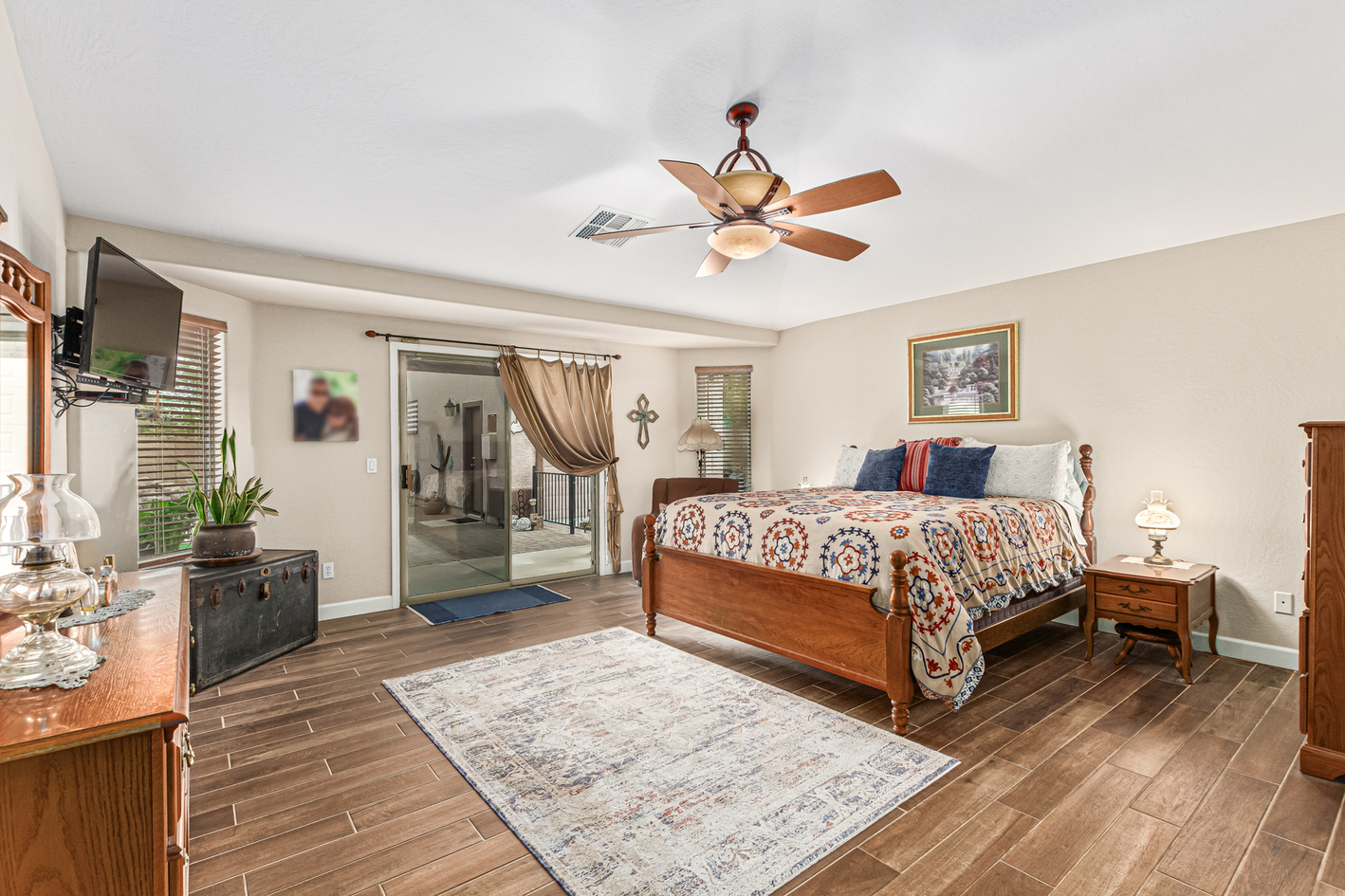 You'll love the main suite that highlights a sitting area with backyard access, a full bathroom & walk-in closet. Secondary bedrooms enjoy a Jack & Jill bathroom! The 3rd bathroom is conveniently located off the hallway. The detached RV garage has a 14' rollup door with opener and is 45' deep, features a workshop area at the rear of the garage. Escape to the backyard paradise that invites you to unwind & have fun! It boasts a full-length covered patio, pavers, artificial turf, a Gazebo, lots of seating areas, & a crystal blue pool. Don't miss the grandeur that awaits in every corner of this remarkable residence!