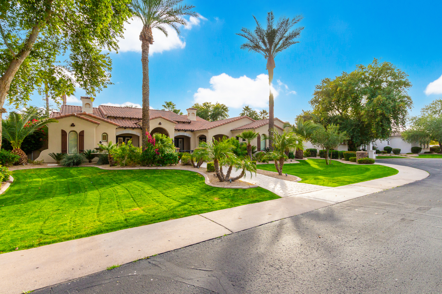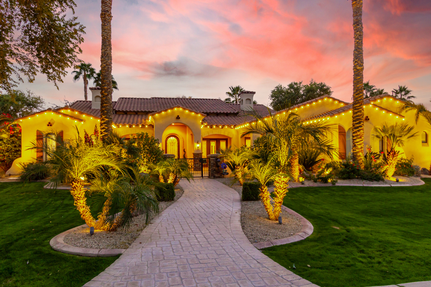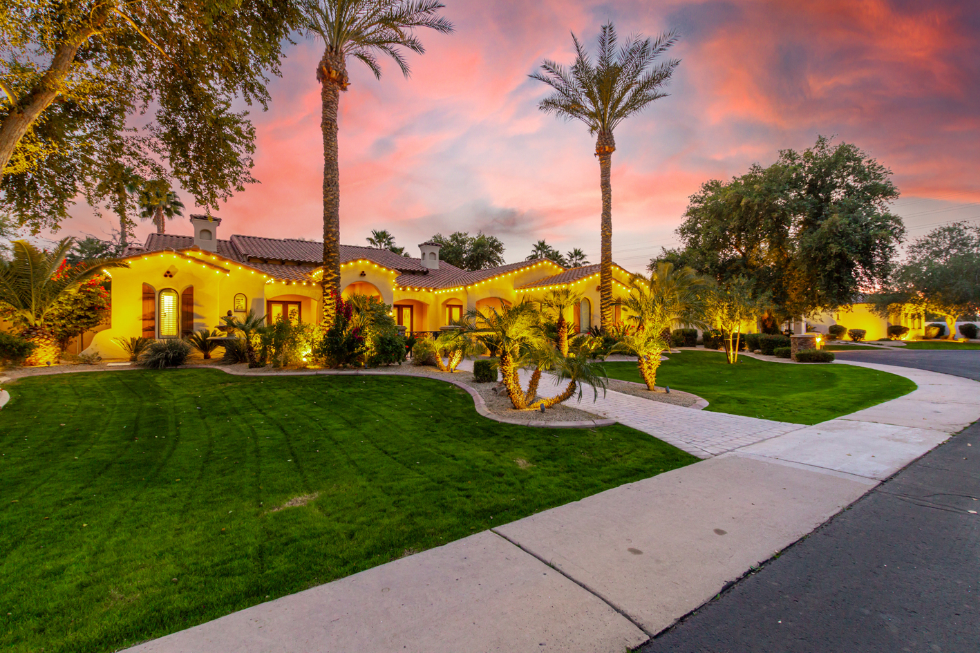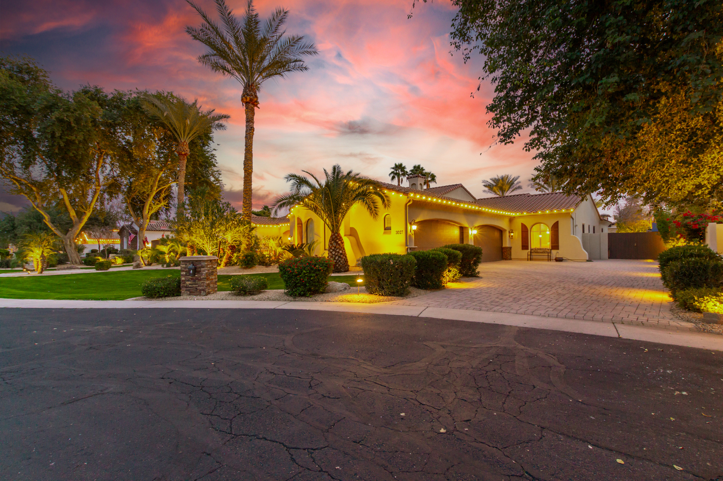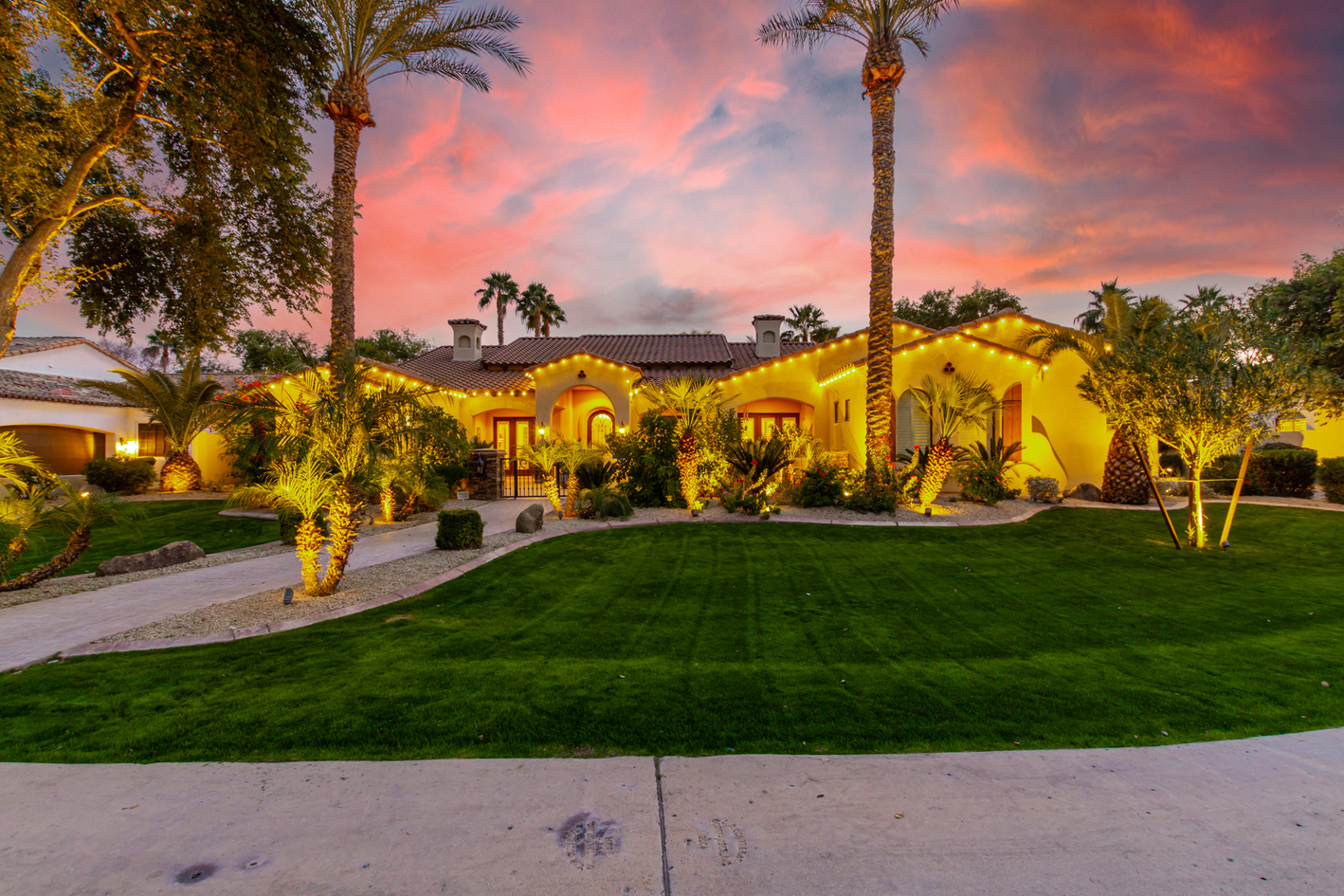 This meticulously kept single-level sanctuary offers an exquisite blend of comfortable living & serene surroundings~Exclusive, gated South Chandler boutique community~Tierra Linda has all Cul de Sac 1/2 acre homesites~A residence designed to host extraordinary gatherings~Offering a seamless flow from the front to the back~Custom builder known for design & unparalleled functionality~Split floor plan boasts 4 spacious bedrooms + office, & 4 baths~Heart of this home is Great room & Kitchen~Featuring double islands, wet bar & a suite of upgraded appliances~Comfort High Efficiency Climate contol~Expansive covered patio w/ misters, café lighting, pool, spa, outdoor kitchen & 2 way fireplace~4-car Garage boasting built-in cabinets, upper storage & pristine epoxy floors~There is Located in a limited, exclusive enclave of just three streets, this North-South positioned home provides the epitome of refined living. Curbside, you are greeted by an extra-large gated courtyard adorned with majestic date palms and assorted flowering shrubs. The tranquil sounds of a fountain create an oasis-like ambiance, inviting you into the interior through large Canterra surrounded Iron grand entry door, which can be opened for the air and sounds of birds and water, as well as the doors, with Phantom screens, from the adjacent office, guest bedroom and dining rooms. The grandeur continues indoors with a spacious master wing, gracefully divided from other bedrooms by a great room and a chef's kitchen adorned with double islands and a wet bar. The open floor plan seamlessly connects gathering, den, and dining spaces, creating an ideal ambiance for both relaxation and entertainment. All bedrooms offer en-suite luxury and generous walk-in closets, ensuring privacy and convenience for residents and guests alike. The heart of this home is a grand open great room and kitchen, featuring double islands, a sleek wet bar, and a suite of upgraded appliances including Wolf, Monogram, Bosch, and Scotsman. This space effortlessly merges elegance with practicality, perfect for daily living and lavish entertaining. Experience comfort without compromise, courtesy of 20 Seer High Efficiency AC units and multi-zoned climate control, ensuring ideal temperatures throughout the home. Escape to the covered patio, an expansive haven complete with misters (making it about 15 degrees cooler for summer entertaining), enchanting café lighting, a refreshing pool, spa, and a separate master bedroom garden with its own hot tub. Revel in the privacy of this outdoor oasis, further enhanced by an outdoor kitchen and a captivating two-way fireplace. Experience resort-style living with a southside pool that basks in sunlight throughout the day. Car enthusiasts will delight in the meticulously maintained 4-car side-facing garage boasting built-in cabinets, upper storage, new garage door equiptment, space for additional fridge or freezer and pristine epoxy floors, ensuring an immaculate space for your prized vehicles. The sellers are allowing the built in ET unit in the Gathering room to convey as well as storage shed, discretely positioned on the west side of the house behind the RV gate to the backyard.