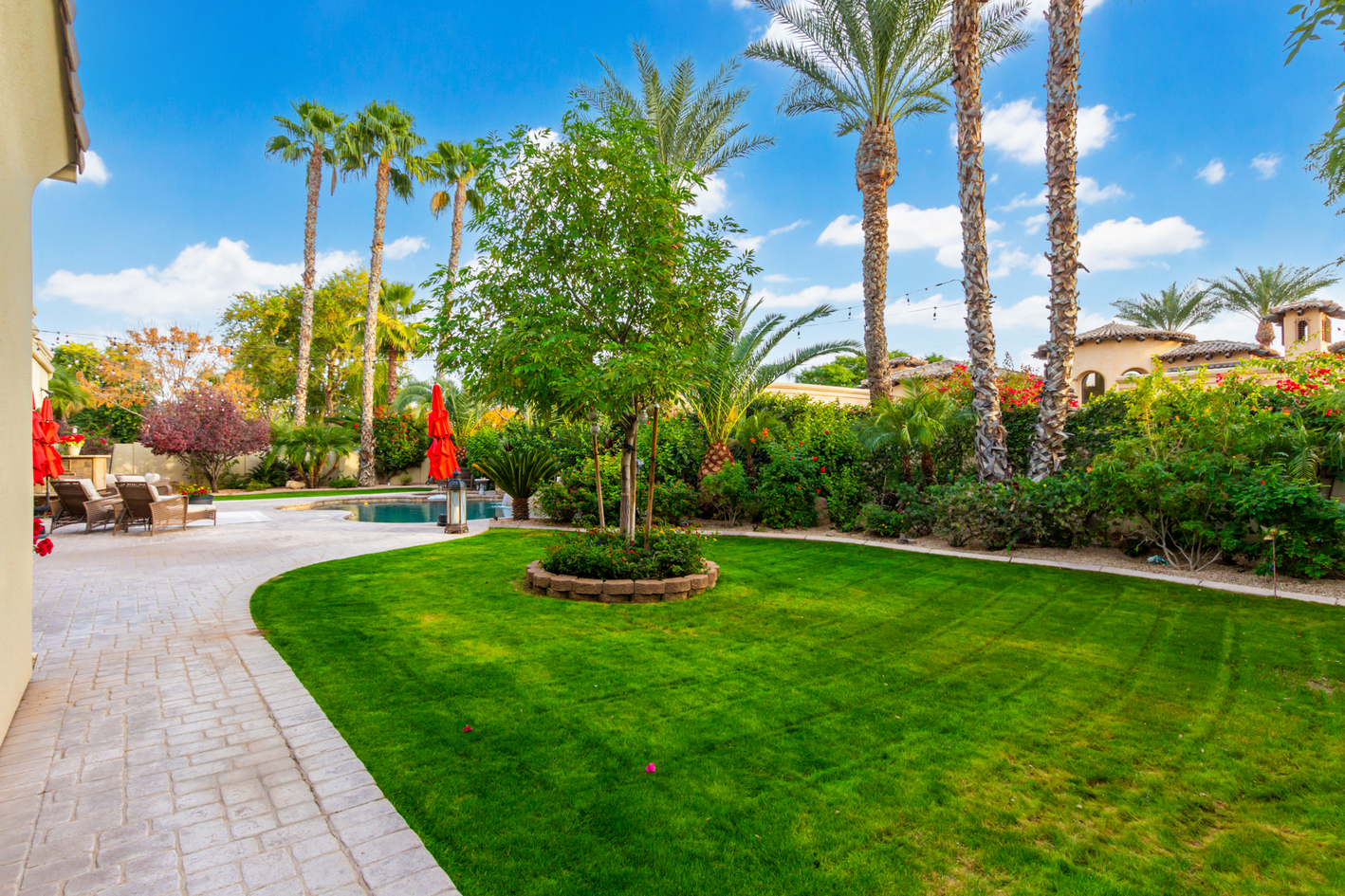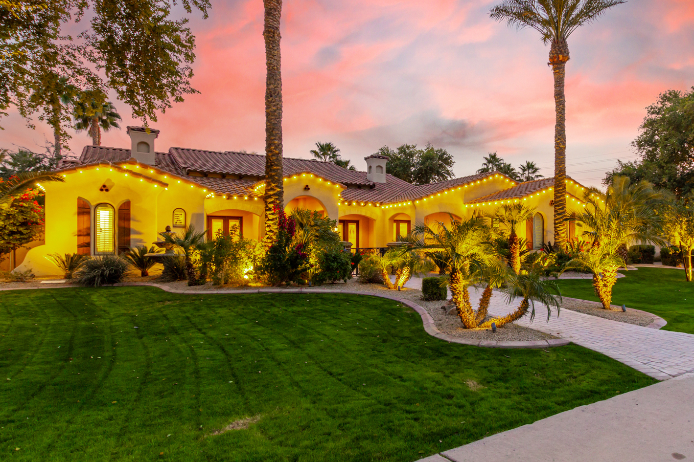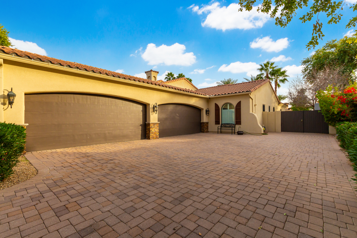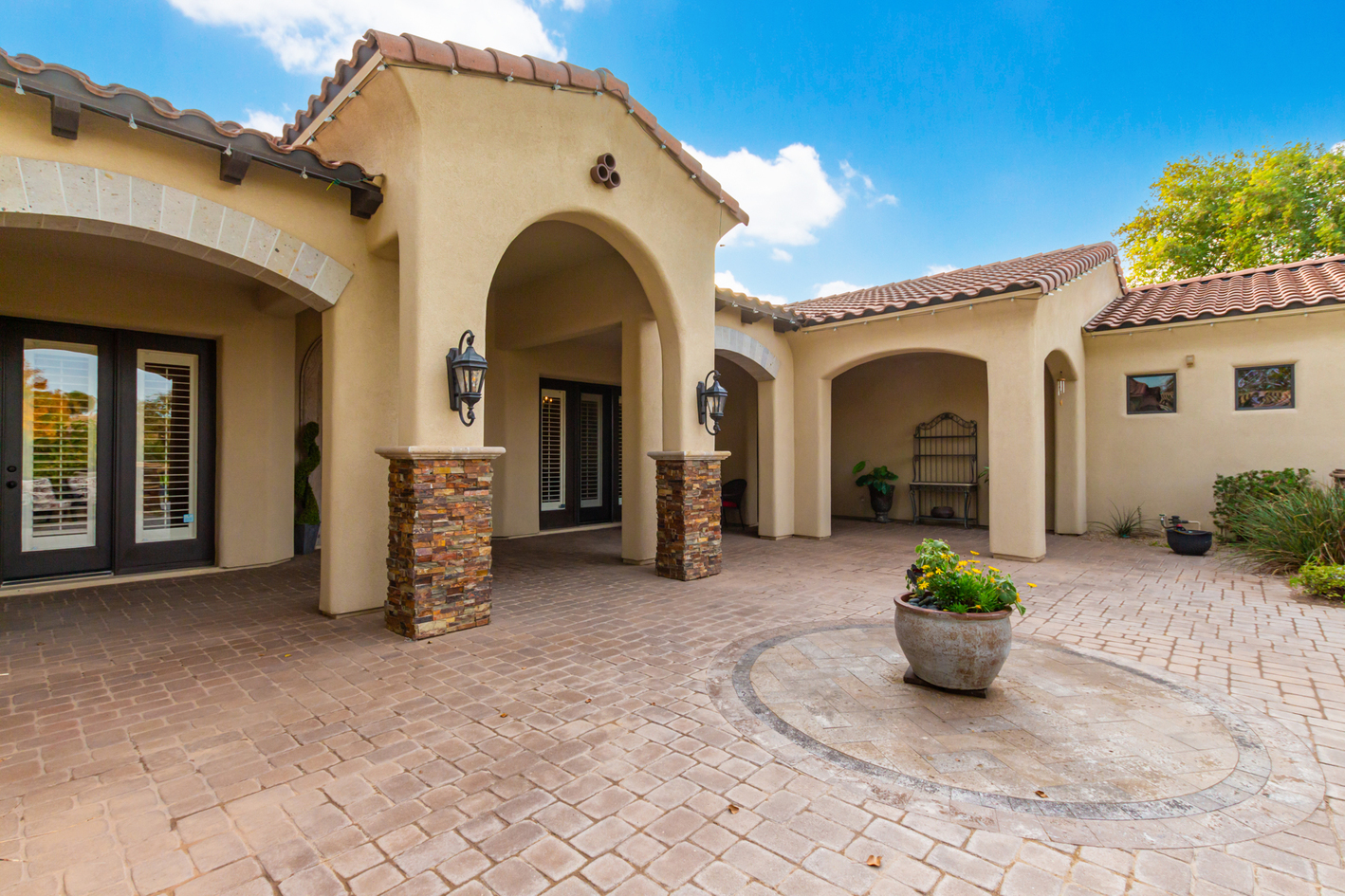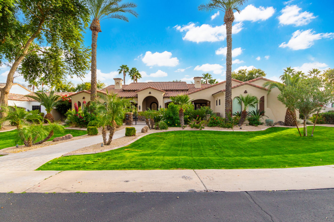 This meticulously kept single-level sanctuary offers an exquisite blend of comfortable living & serene surroundings~Exclusive, gated South Chandler boutique community~Tierra Linda has all Cul de Sac 1/2 acre homesites~A residence designed to host extraordinary gatherings~Offering a seamless flow from the front to the back~Custom builder known for design & unparalleled functionality~Split floor plan boasts 4 spacious bedrooms + office, & 4 baths~Heart of this home is Great room & Kitchen~Featuring double islands, wet bar & a suite of upgraded appliances~Comfort High Efficiency Climate contol~Expansive covered patio w/ misters, café lighting, pool, spa, outdoor kitchen & 2 way fireplace~4-car Garage boasting built-in cabinets, upper storage & pristine epoxy floors~There is Located in a limited, exclusive enclave of just three streets, this North-South positioned home provides the epitome of refined living. Curbside, you are greeted by an extra-large gated courtyard adorned with majestic date palms and assorted flowering shrubs. The tranquil sounds of a fountain create an oasis-like ambiance, inviting you into the interior through large Canterra surrounded Iron grand entry door, which can be opened for the air and sounds of birds and water, as well as the doors, with Phantom screens, from the adjacent office, guest bedroom and dining rooms. The grandeur continues indoors with a spacious master wing, gracefully divided from other bedrooms by a great room and a chef's kitchen adorned with double islands and a wet bar. The open floor plan seamlessly connects gathering, den, and dining spaces, creating an ideal ambiance for both relaxation and entertainment. All bedrooms offer en-suite luxury and generous walk-in closets, ensuring privacy and convenience for residents and guests alike. The heart of this home is a grand open great room and kitchen, featuring double islands, a sleek wet bar, and a suite of upgraded appliances including Wolf, Monogram, Bosch, and Scotsman. This space effortlessly merges elegance with practicality, perfect for daily living and lavish entertaining. Experience comfort without compromise, courtesy of 20 Seer High Efficiency AC units and multi-zoned climate control, ensuring ideal temperatures throughout the home. Escape to the covered patio, an expansive haven complete with misters (making it about 15 degrees cooler for summer entertaining), enchanting café lighting, a refreshing pool, spa, and a separate master bedroom garden with its own hot tub. Revel in the privacy of this outdoor oasis, further enhanced by an outdoor kitchen and a captivating two-way fireplace. Experience resort-style living with a southside pool that basks in sunlight throughout the day. Car enthusiasts will delight in the meticulously maintained 4-car side-facing garage boasting built-in cabinets, upper storage, new garage door equiptment, space for additional fridge or freezer and pristine epoxy floors, ensuring an immaculate space for your prized vehicles. The sellers are allowing the built in ET unit in the Gathering room to convey as well as storage shed, discretely positioned on the west side of the house behind the RV gate to the backyard.