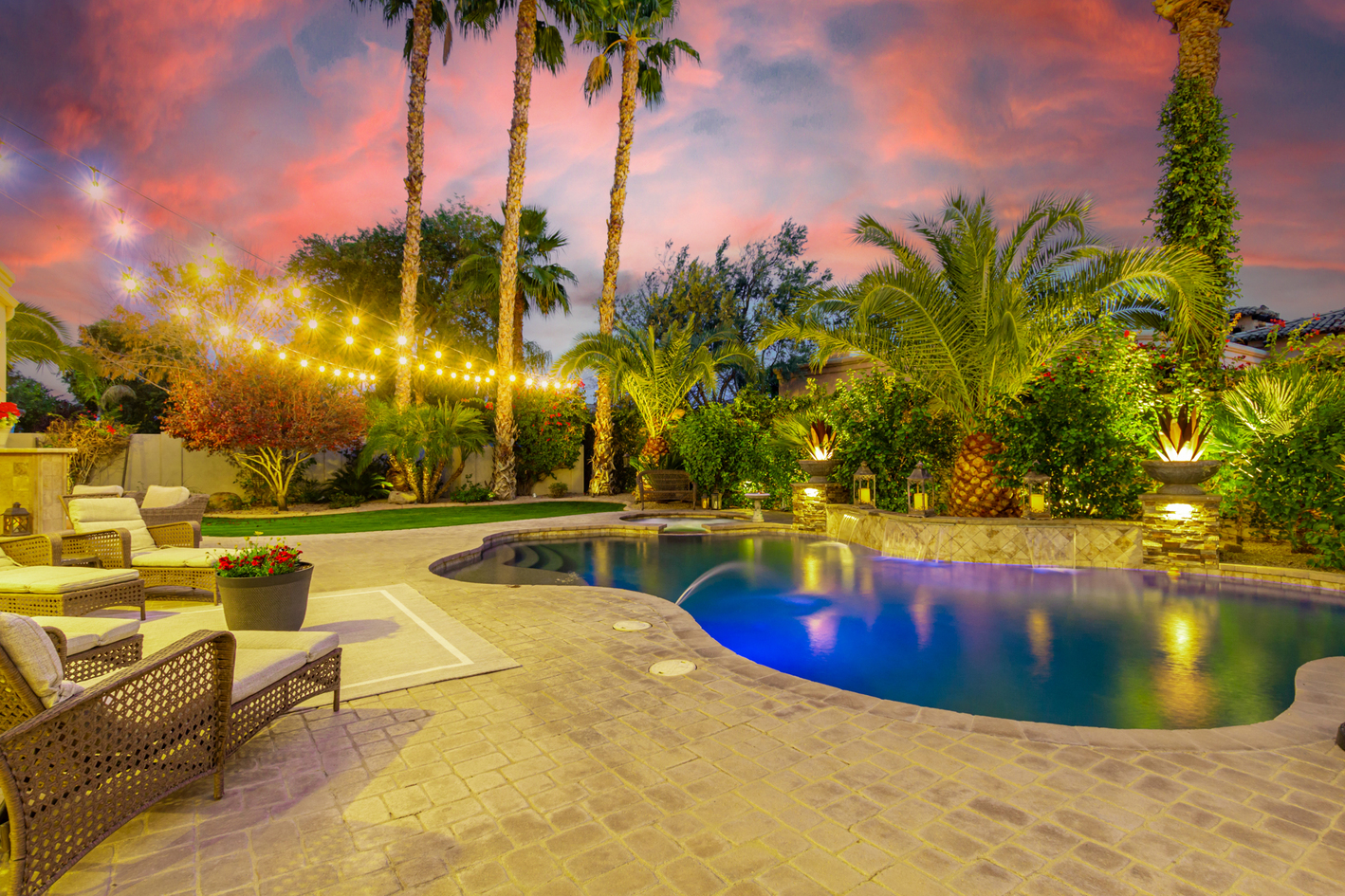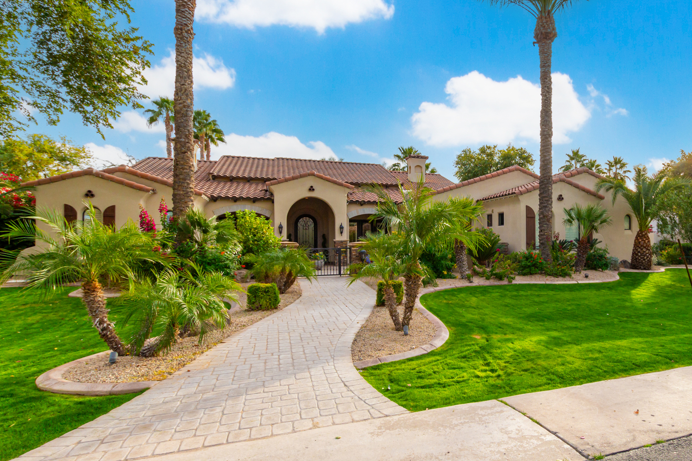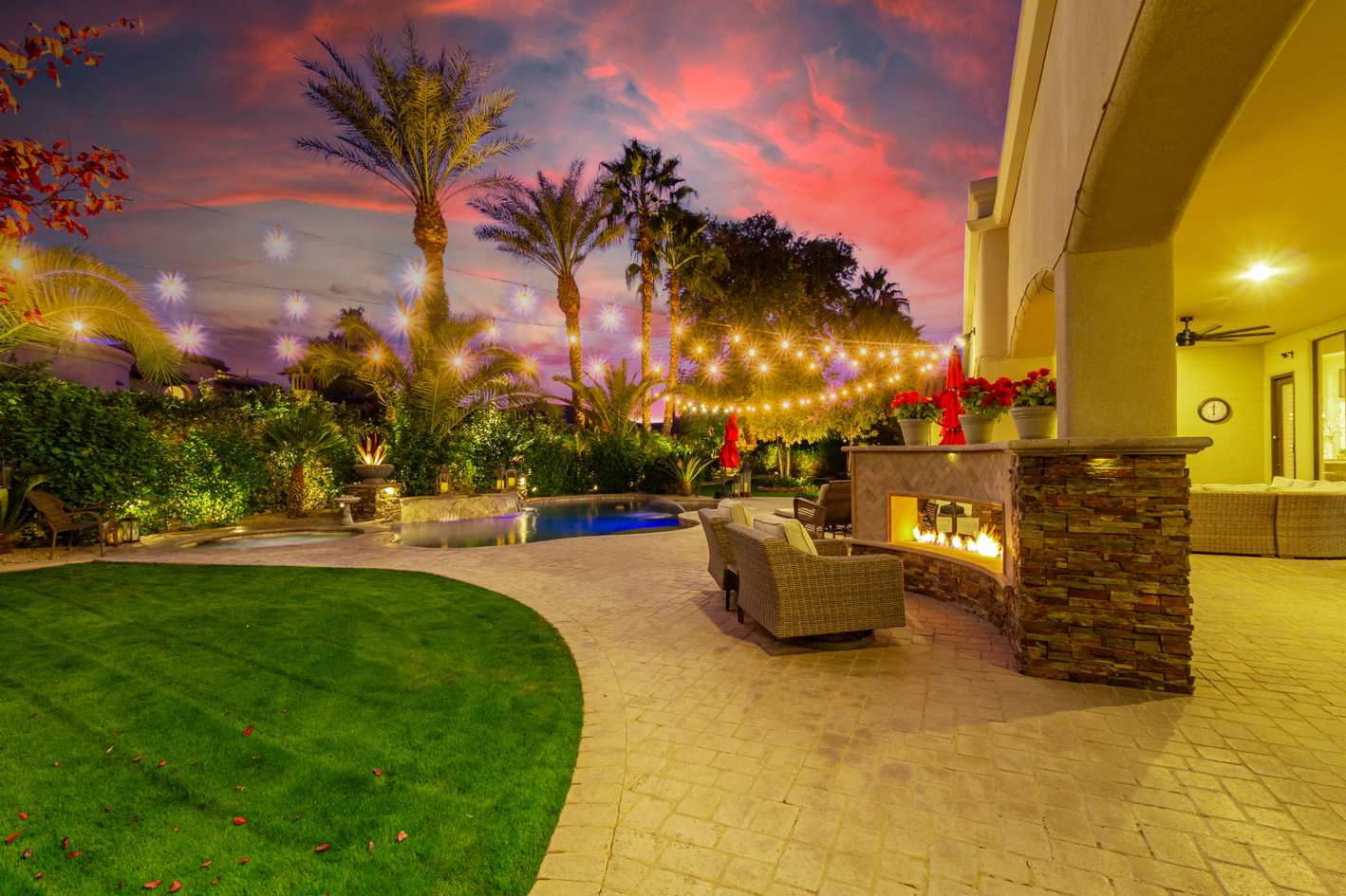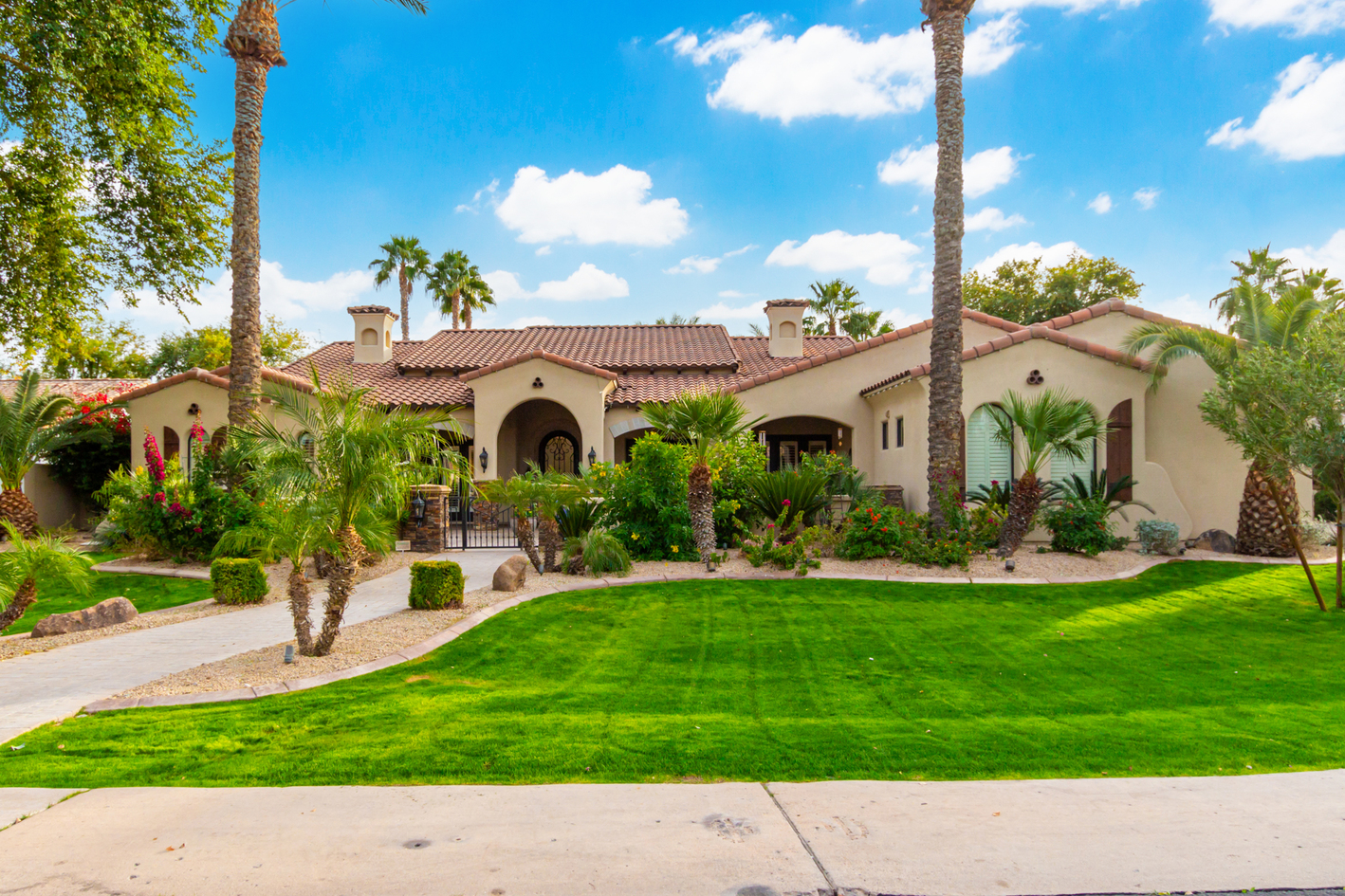 This meticulously kept single-level sanctuary offers an exquisite blend of comfortable living & serene surroundings~Exclusive, gated South Chandler boutique community~Tierra Linda has all Cul de Sac 1/2 acre homesites~A residence designed to host extraordinary gatherings~Offering a seamless flow from the front to the back~Custom builder known for design & unparalleled functionality~Split floor plan boasts 4 spacious bedrooms + office, & 4 baths~Heart of this home is Great room & Kitchen~Featuring double islands, wet bar & a suite of upgraded appliances~Comfort High Efficiency Climate contol~Expansive covered patio w/ misters, café lighting, pool, spa, outdoor kitchen & 2 way fireplace~4-car Garage boasting built-in cabinets, upper storage & pristine epoxy floors~There is Located in a limited, exclusive enclave of just three streets, this North-South positioned home provides the epitome of refined living. Curbside, you are greeted by an extra-large gated courtyard adorned with majestic date palms and assorted flowering shrubs. The tranquil sounds of a fountain create an oasis-like ambiance, inviting you into the interior through large Canterra surrounded Iron grand entry door, which can be opened for the air and sounds of birds and water, as well as the doors, with Phantom screens, from the adjacent office, guest bedroom and dining rooms. The grandeur continues indoors with a spacious master wing, gracefully divided from other bedrooms by a great room and a chef's kitchen adorned with double islands and a wet bar. The open floor plan seamlessly connects gathering, den, and dining spaces, creating an ideal ambiance for both relaxation and entertainment. All bedrooms offer en-suite luxury and generous walk-in closets, ensuring privacy and convenience for residents and guests alike. The heart of this home is a grand open great room and kitchen, featuring double islands, a sleek wet bar, and a suite of upgraded appliances including Wolf, Monogram, Bosch, and Scotsman. This space effortlessly merges elegance with practicality, perfect for daily living and lavish entertaining. Experience comfort without compromise, courtesy of 20 Seer High Efficiency AC units and multi-zoned climate control, ensuring ideal temperatures throughout the home. Escape to the covered patio, an expansive haven complete with misters (making it about 15 degrees cooler for summer entertaining), enchanting café lighting, a refreshing pool, spa, and a separate master bedroom garden with its own hot tub. Revel in the privacy of this outdoor oasis, further enhanced by an outdoor kitchen and a captivating two-way fireplace. Experience resort-style living with a southside pool that basks in sunlight throughout the day. Car enthusiasts will delight in the meticulously maintained 4-car side-facing garage boasting built-in cabinets, upper storage, new garage door equiptment, space for additional fridge or freezer and pristine epoxy floors, ensuring an immaculate space for your prized vehicles. The sellers are allowing the built in ET unit in the Gathering room to convey as well as storage shed, discretely positioned on the west side of the house behind the RV gate to the backyard.