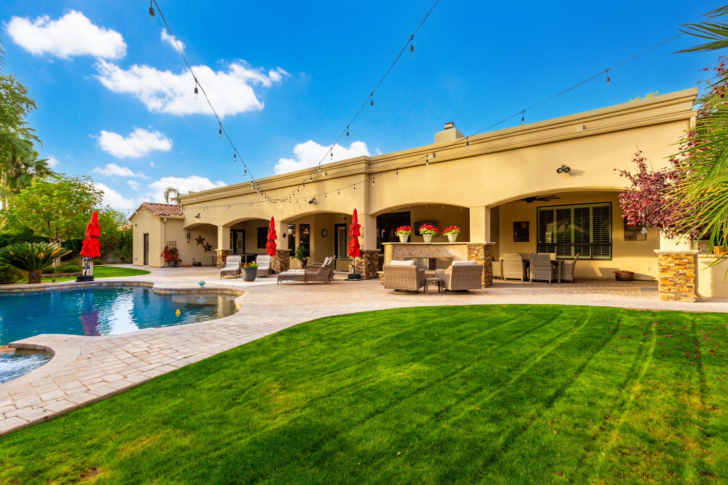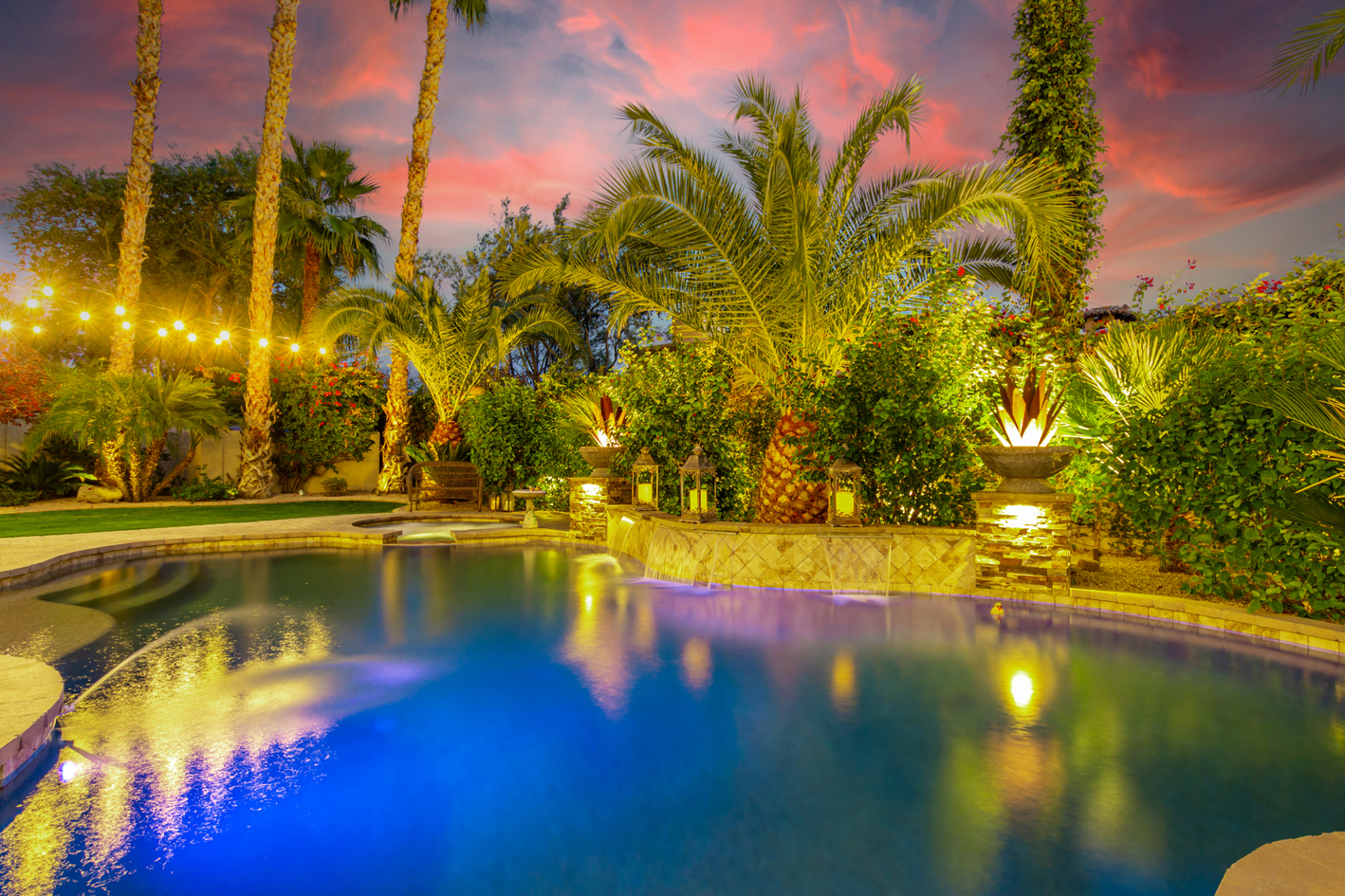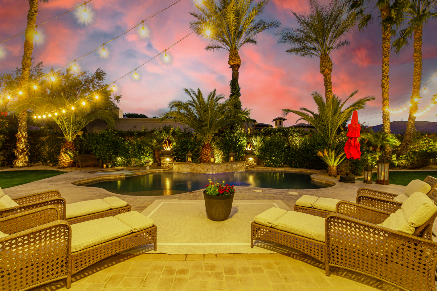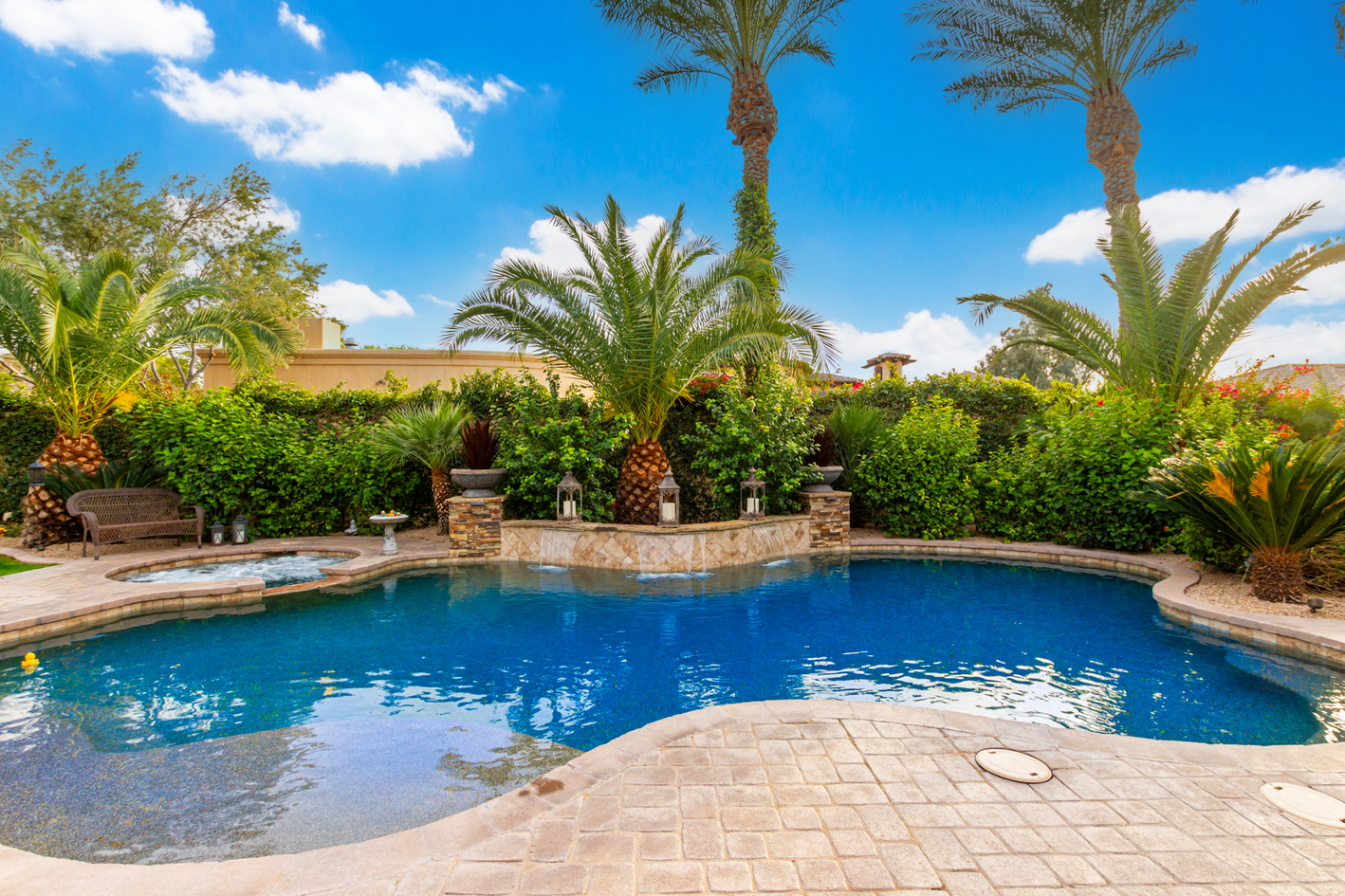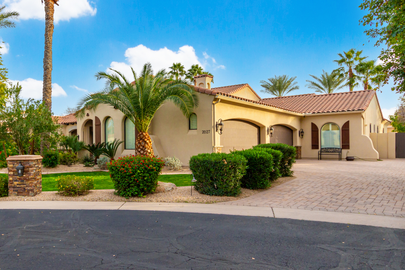 This meticulously kept single-level sanctuary offers an exquisite blend of comfortable living & serene surroundings~Exclusive, gated South Chandler boutique community~Tierra Linda has all Cul de Sac 1/2 acre homesites~A residence designed to host extraordinary gatherings~Offering a seamless flow from the front to the back~Custom builder known for design & unparalleled functionality~Split floor plan boasts 4 spacious bedrooms + office, & 4 baths~Heart of this home is Great room & Kitchen~Featuring double islands, wet bar & a suite of upgraded appliances~Comfort High Efficiency Climate contol~Expansive covered patio w/ misters, café lighting, pool, spa, outdoor kitchen & 2 way fireplace~4-car Garage boasting built-in cabinets, upper storage & pristine epoxy floors~There is Located in a limited, exclusive enclave of just three streets, this North-South positioned home provides the epitome of refined living. Curbside, you are greeted by an extra-large gated courtyard adorned with majestic date palms and assorted flowering shrubs. The tranquil sounds of a fountain create an oasis-like ambiance, inviting you into the interior through large Canterra surrounded Iron grand entry door, which can be opened for the air and sounds of birds and water, as well as the doors, with Phantom screens, from the adjacent office, guest bedroom and dining rooms. The grandeur continues indoors with a spacious master wing, gracefully divided from other bedrooms by a great room and a chef's kitchen adorned with double islands and a wet bar. The open floor plan seamlessly connects gathering, den, and dining spaces, creating an ideal ambiance for both relaxation and entertainment. All bedrooms offer en-suite luxury and generous walk-in closets, ensuring privacy and convenience for residents and guests alike. The heart of this home is a grand open great room and kitchen, featuring double islands, a sleek wet bar, and a suite of upgraded appliances including Wolf, Monogram, Bosch, and Scotsman. This space effortlessly merges elegance with practicality, perfect for daily living and lavish entertaining. Experience comfort without compromise, courtesy of 20 Seer High Efficiency AC units and multi-zoned climate control, ensuring ideal temperatures throughout the home. Escape to the covered patio, an expansive haven complete with misters (making it about 15 degrees cooler for summer entertaining), enchanting café lighting, a refreshing pool, spa, and a separate master bedroom garden with its own hot tub. Revel in the privacy of this outdoor oasis, further enhanced by an outdoor kitchen and a captivating two-way fireplace. Experience resort-style living with a southside pool that basks in sunlight throughout the day. Car enthusiasts will delight in the meticulously maintained 4-car side-facing garage boasting built-in cabinets, upper storage, new garage door equiptment, space for additional fridge or freezer and pristine epoxy floors, ensuring an immaculate space for your prized vehicles. The sellers are allowing the built in ET unit in the Gathering room to convey as well as storage shed, discretely positioned on the west side of the house behind the RV gate to the backyard.