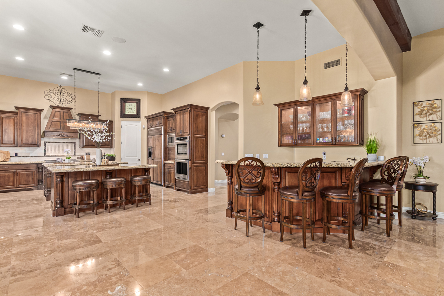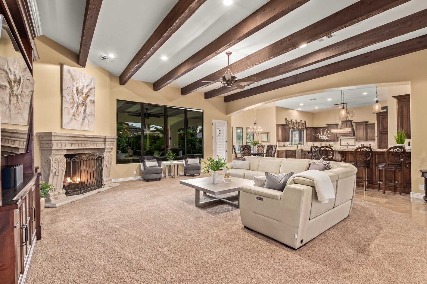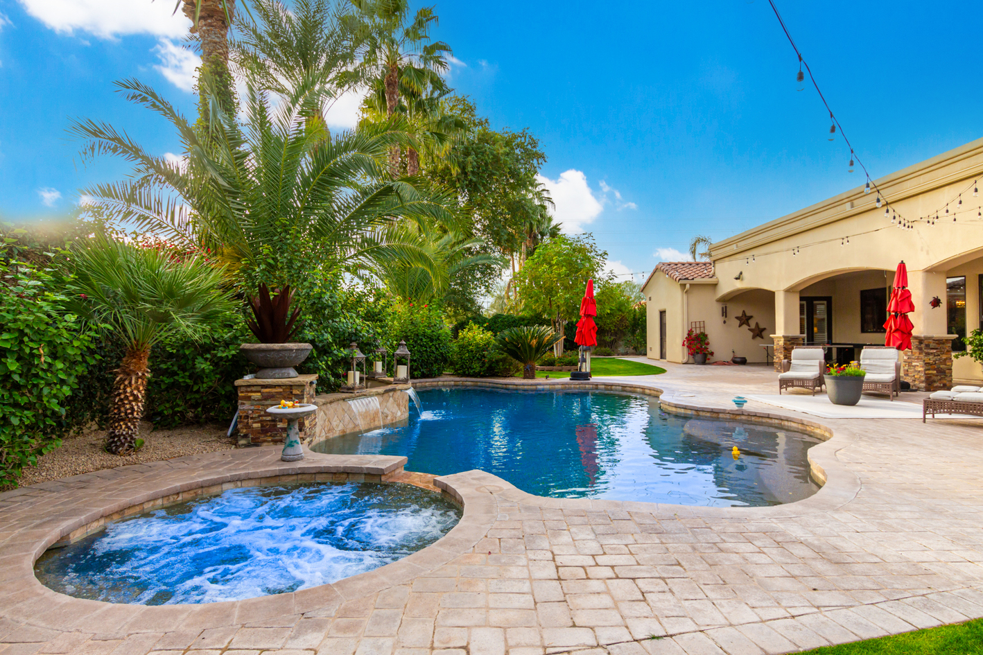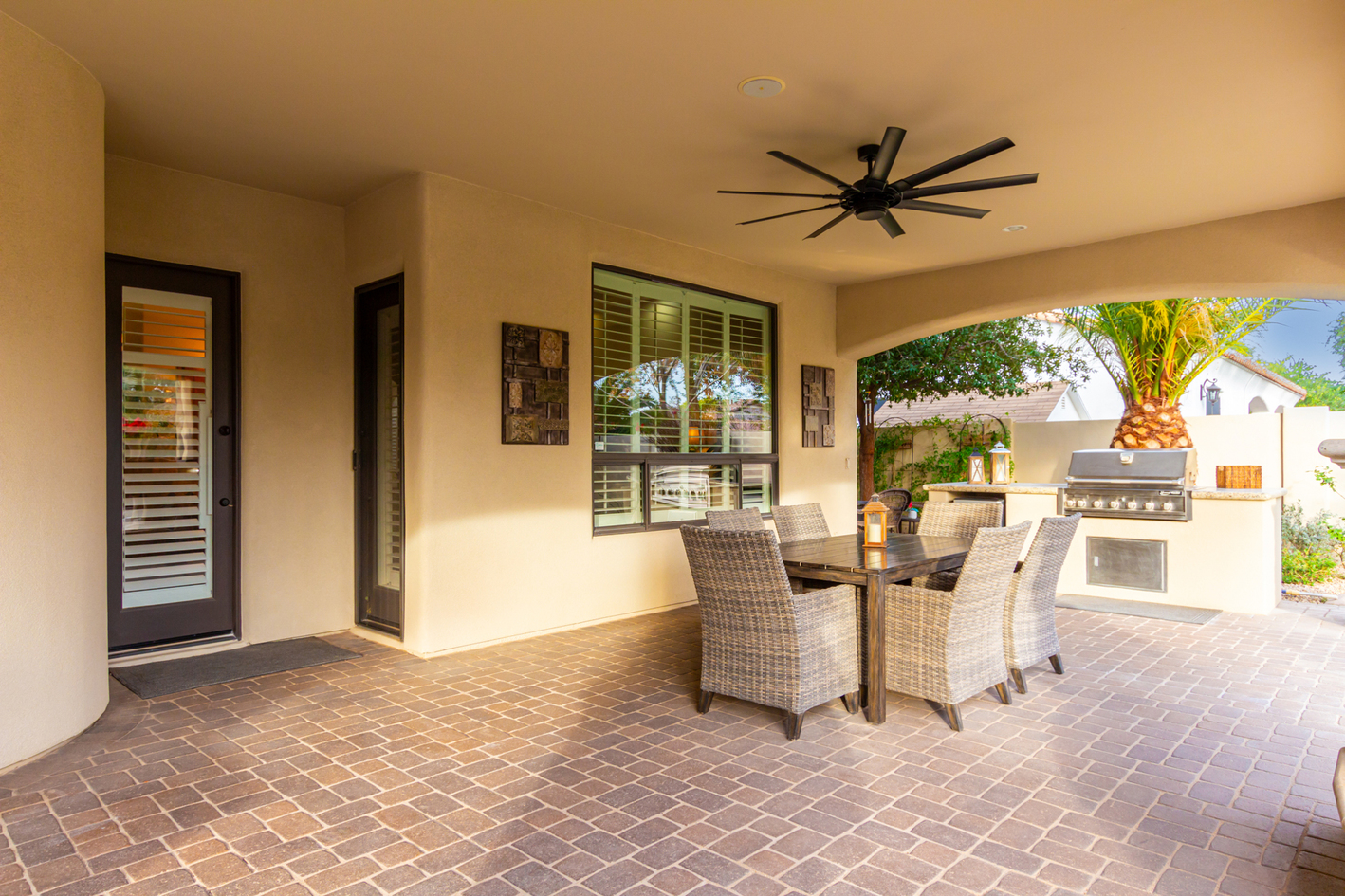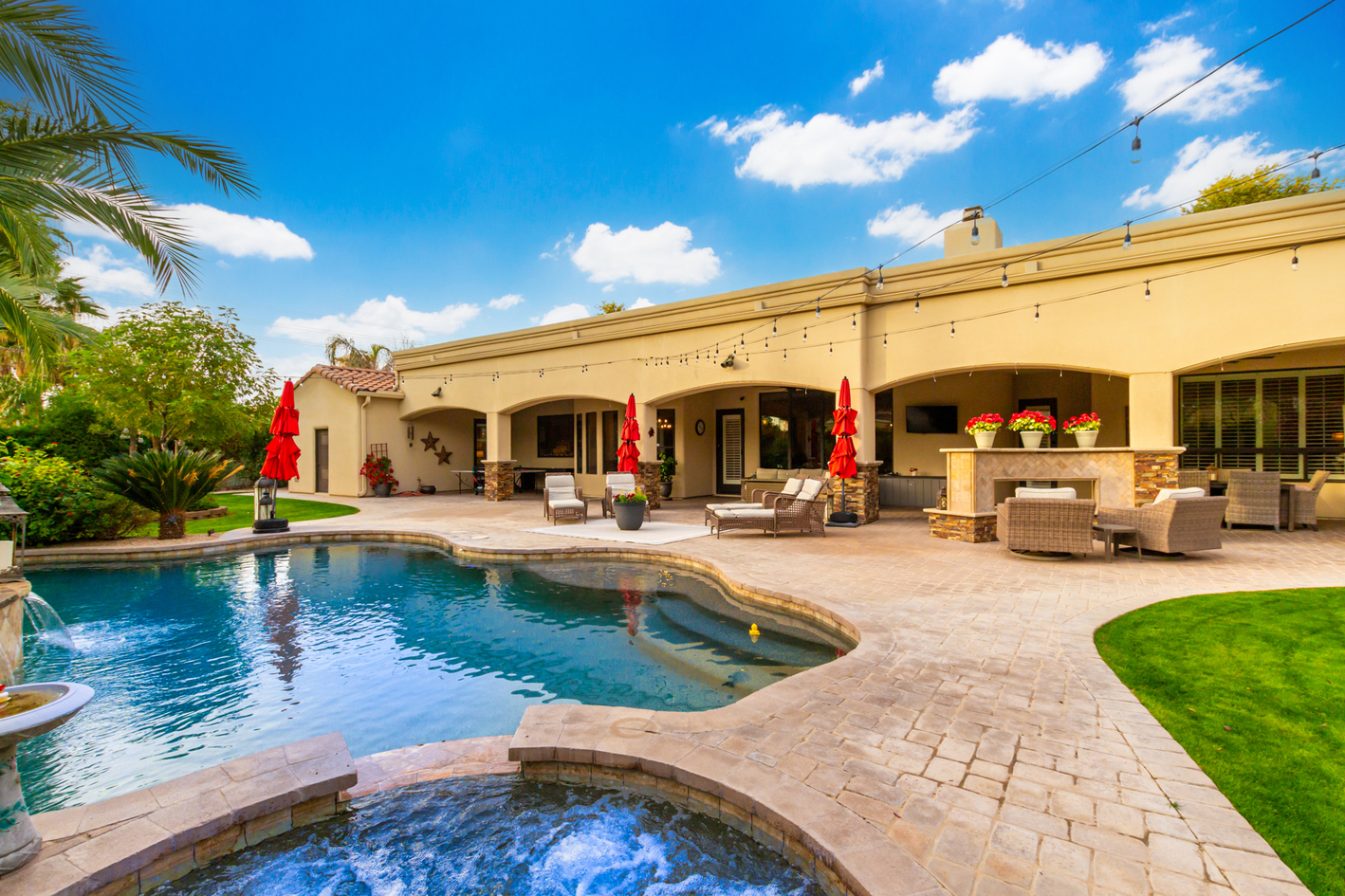 This meticulously kept single-level sanctuary offers an exquisite blend of comfortable living & serene surroundings~Exclusive, gated South Chandler boutique community~Tierra Linda has all Cul de Sac 1/2 acre homesites~A residence designed to host extraordinary gatherings~Offering a seamless flow from the front to the back~Custom builder known for design & unparalleled functionality~Split floor plan boasts 4 spacious bedrooms + office, & 4 baths~Heart of this home is Great room & Kitchen~Featuring double islands, wet bar & a suite of upgraded appliances~Comfort High Efficiency Climate contol~Expansive covered patio w/ misters, café lighting, pool, spa, outdoor kitchen & 2 way fireplace~4-car Garage boasting built-in cabinets, upper storage & pristine epoxy floors~There is Located in a limited, exclusive enclave of just three streets, this North-South positioned home provides the epitome of refined living. Curbside, you are greeted by an extra-large gated courtyard adorned with majestic date palms and assorted flowering shrubs. The tranquil sounds of a fountain create an oasis-like ambiance, inviting you into the interior through large Canterra surrounded Iron grand entry door, which can be opened for the air and sounds of birds and water, as well as the doors, with Phantom screens, from the adjacent office, guest bedroom and dining rooms. The grandeur continues indoors with a spacious master wing, gracefully divided from other bedrooms by a great room and a chef's kitchen adorned with double islands and a wet bar. The open floor plan seamlessly connects gathering, den, and dining spaces, creating an ideal ambiance for both relaxation and entertainment. All bedrooms offer en-suite luxury and generous walk-in closets, ensuring privacy and convenience for residents and guests alike. The heart of this home is a grand open great room and kitchen, featuring double islands, a sleek wet bar, and a suite of upgraded appliances including Wolf, Monogram, Bosch, and Scotsman. This space effortlessly merges elegance with practicality, perfect for daily living and lavish entertaining. Experience comfort without compromise, courtesy of 20 Seer High Efficiency AC units and multi-zoned climate control, ensuring ideal temperatures throughout the home. Escape to the covered patio, an expansive haven complete with misters (making it about 15 degrees cooler for summer entertaining), enchanting café lighting, a refreshing pool, spa, and a separate master bedroom garden with its own hot tub. Revel in the privacy of this outdoor oasis, further enhanced by an outdoor kitchen and a captivating two-way fireplace. Experience resort-style living with a southside pool that basks in sunlight throughout the day. Car enthusiasts will delight in the meticulously maintained 4-car side-facing garage boasting built-in cabinets, upper storage, new garage door equiptment, space for additional fridge or freezer and pristine epoxy floors, ensuring an immaculate space for your prized vehicles. The sellers are allowing the built in ET unit in the Gathering room to convey as well as storage shed, discretely positioned on the west side of the house behind the RV gate to the backyard.