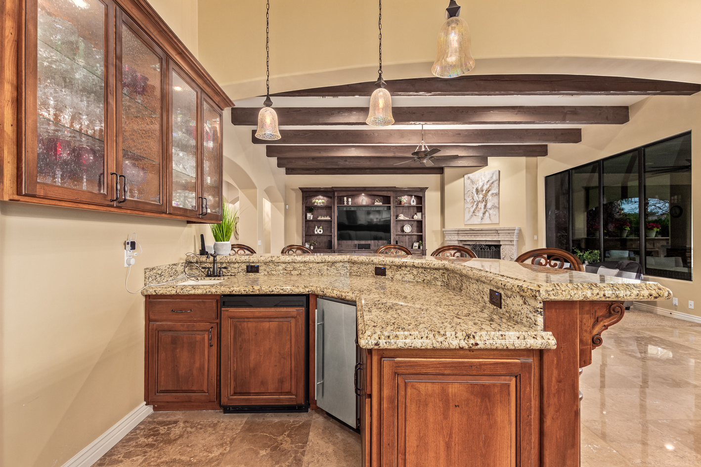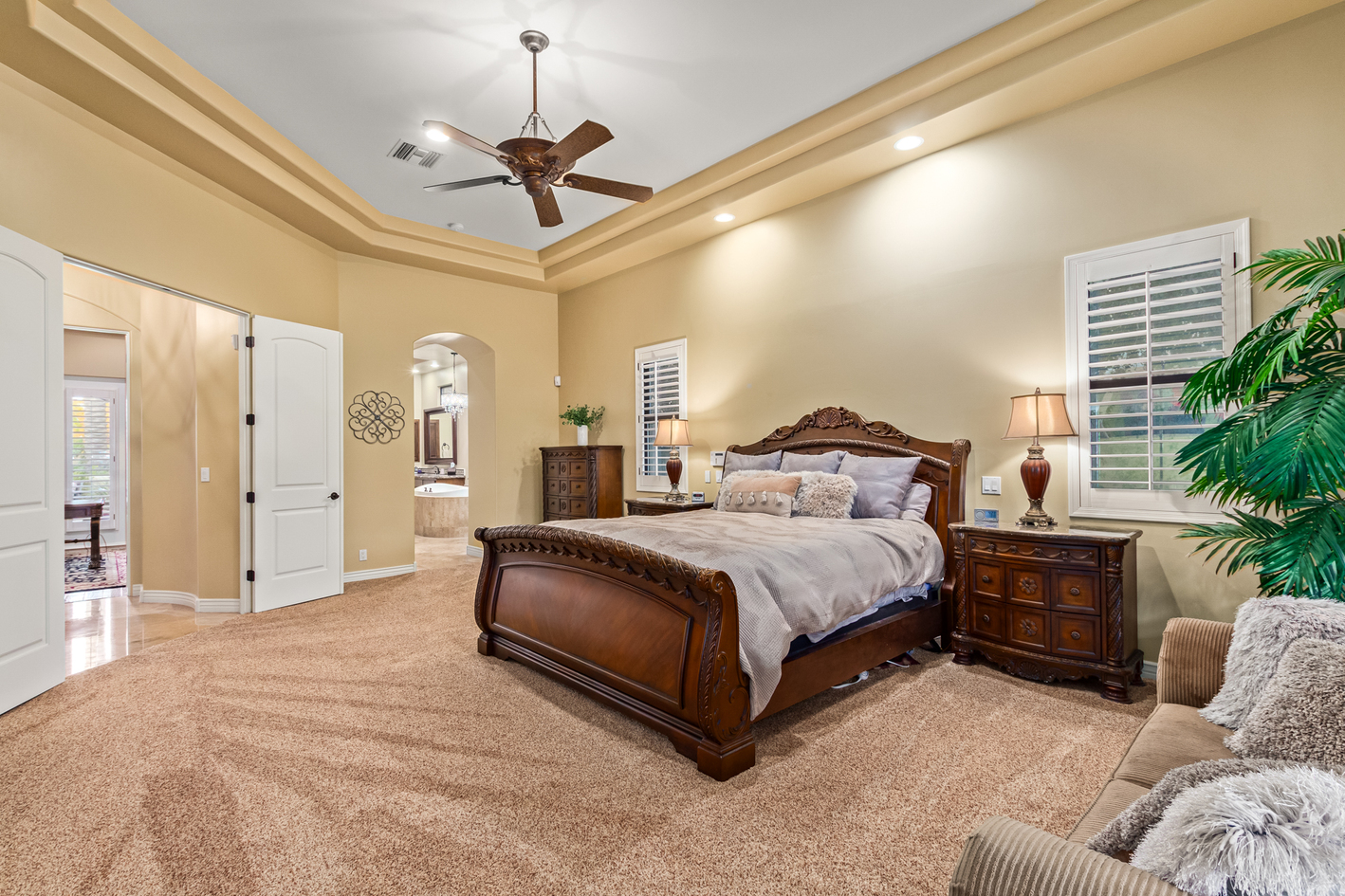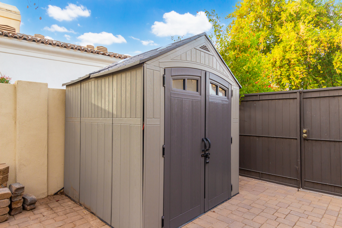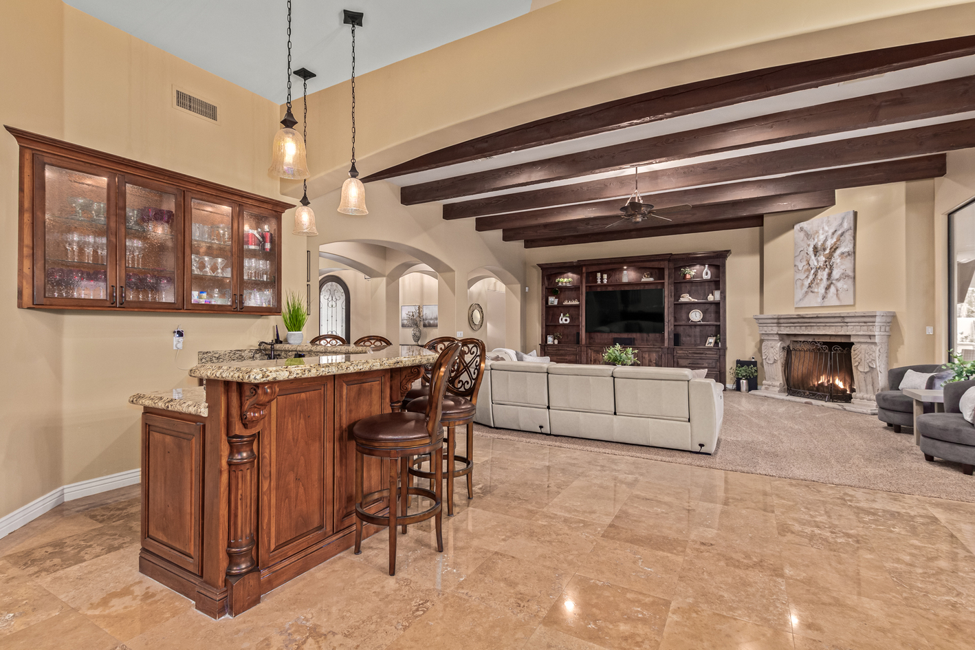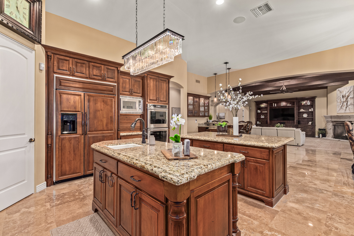 This meticulously kept single-level sanctuary offers an exquisite blend of comfortable living & serene surroundings~Exclusive, gated South Chandler boutique community~Tierra Linda has all Cul de Sac 1/2 acre homesites~A residence designed to host extraordinary gatherings~Offering a seamless flow from the front to the back~Custom builder known for design & unparalleled functionality~Split floor plan boasts 4 spacious bedrooms + office, & 4 baths~Heart of this home is Great room & Kitchen~Featuring double islands, wet bar & a suite of upgraded appliances~Comfort High Efficiency Climate contol~Expansive covered patio w/ misters, café lighting, pool, spa, outdoor kitchen & 2 way fireplace~4-car Garage boasting built-in cabinets, upper storage & pristine epoxy floors~There is Located in a limited, exclusive enclave of just three streets, this North-South positioned home provides the epitome of refined living. Curbside, you are greeted by an extra-large gated courtyard adorned with majestic date palms and assorted flowering shrubs. The tranquil sounds of a fountain create an oasis-like ambiance, inviting you into the interior through large Canterra surrounded Iron grand entry door, which can be opened for the air and sounds of birds and water, as well as the doors, with Phantom screens, from the adjacent office, guest bedroom and dining rooms. The grandeur continues indoors with a spacious master wing, gracefully divided from other bedrooms by a great room and a chef's kitchen adorned with double islands and a wet bar. The open floor plan seamlessly connects gathering, den, and dining spaces, creating an ideal ambiance for both relaxation and entertainment. All bedrooms offer en-suite luxury and generous walk-in closets, ensuring privacy and convenience for residents and guests alike. The heart of this home is a grand open great room and kitchen, featuring double islands, a sleek wet bar, and a suite of upgraded appliances including Wolf, Monogram, Bosch, and Scotsman. This space effortlessly merges elegance with practicality, perfect for daily living and lavish entertaining. Experience comfort without compromise, courtesy of 20 Seer High Efficiency AC units and multi-zoned climate control, ensuring ideal temperatures throughout the home. Escape to the covered patio, an expansive haven complete with misters (making it about 15 degrees cooler for summer entertaining), enchanting café lighting, a refreshing pool, spa, and a separate master bedroom garden with its own hot tub. Revel in the privacy of this outdoor oasis, further enhanced by an outdoor kitchen and a captivating two-way fireplace. Experience resort-style living with a southside pool that basks in sunlight throughout the day. Car enthusiasts will delight in the meticulously maintained 4-car side-facing garage boasting built-in cabinets, upper storage, new garage door equiptment, space for additional fridge or freezer and pristine epoxy floors, ensuring an immaculate space for your prized vehicles. The sellers are allowing the built in ET unit in the Gathering room to convey as well as storage shed, discretely positioned on the west side of the house behind the RV gate to the backyard.
